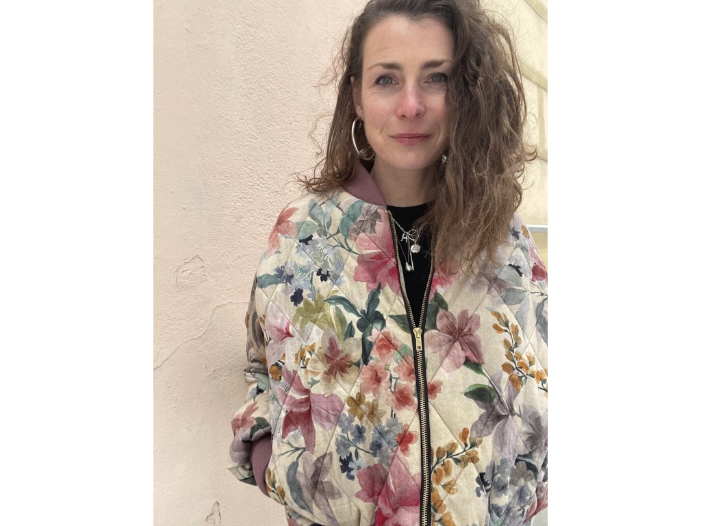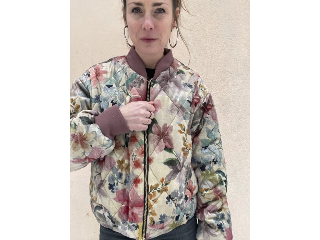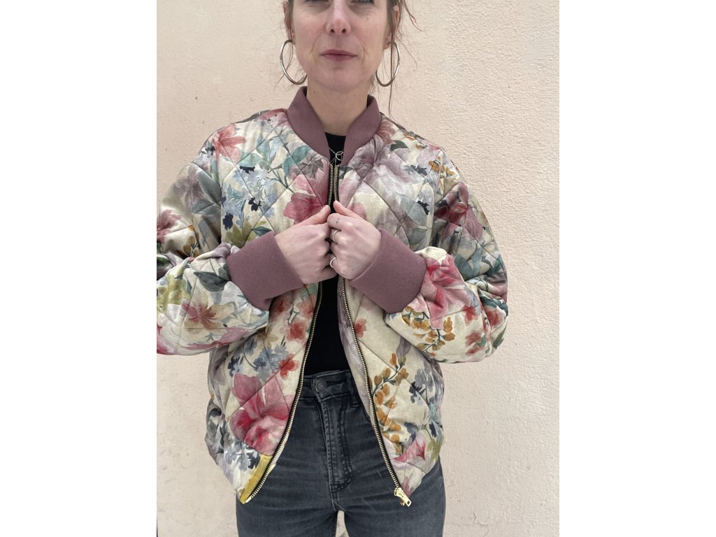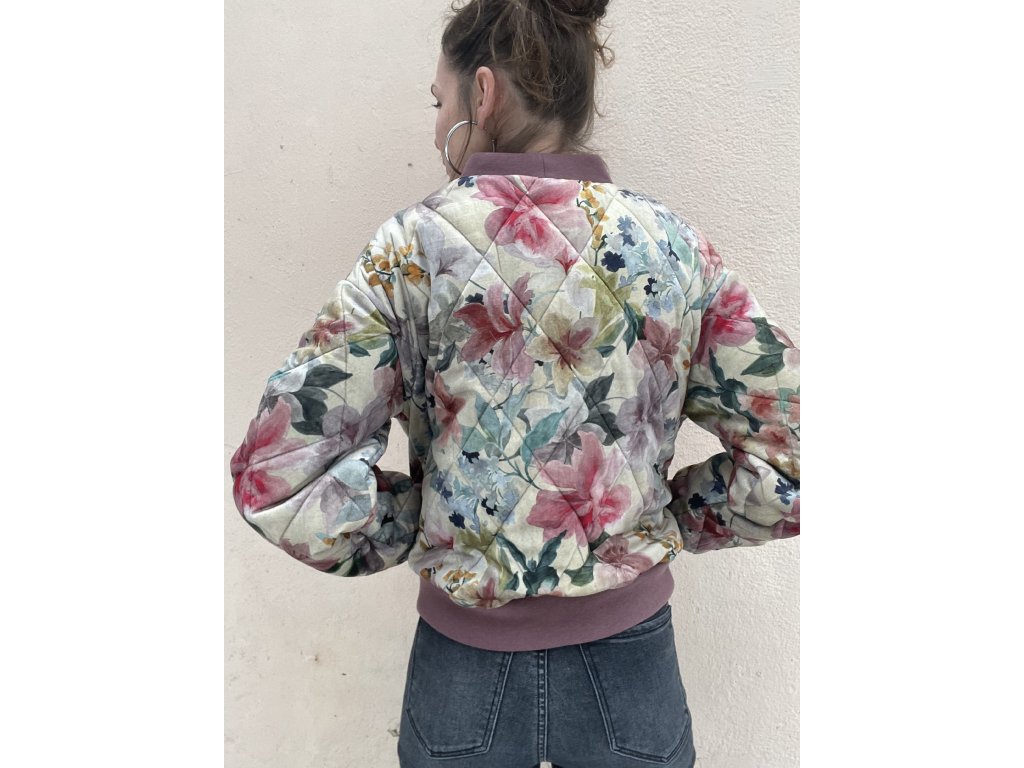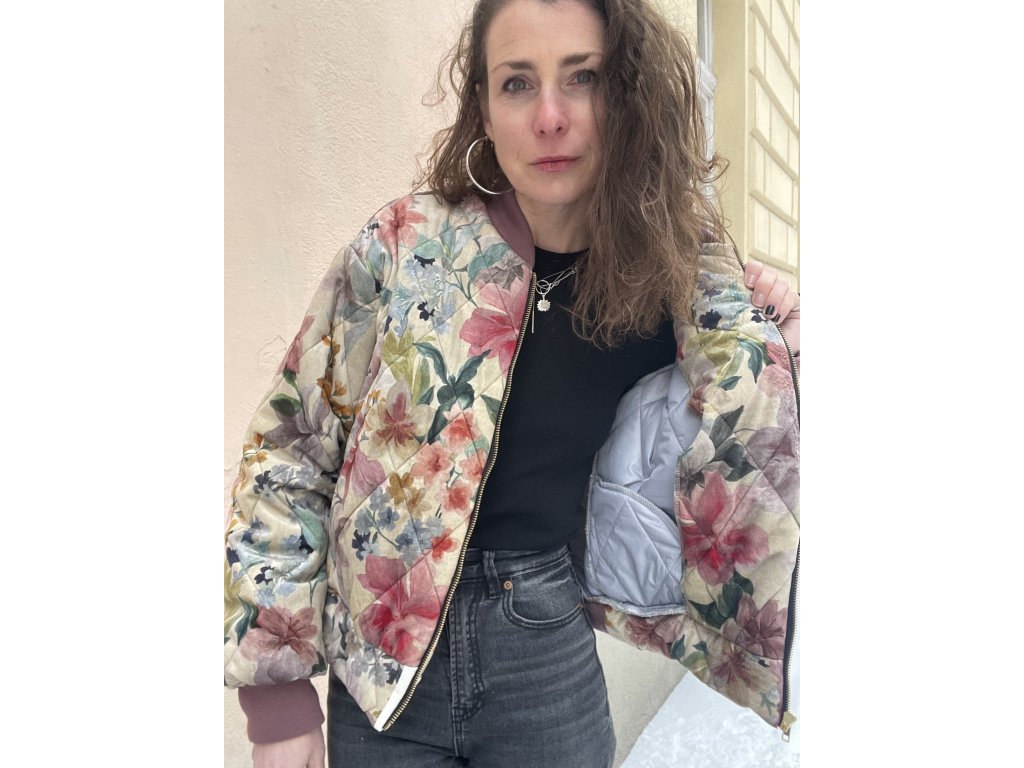 Bunda má volný oversize střih, je ze sametového květinového proševu, který ma z rubu stříbrnou podšívku.