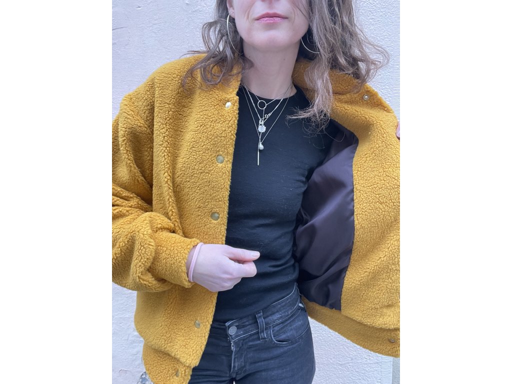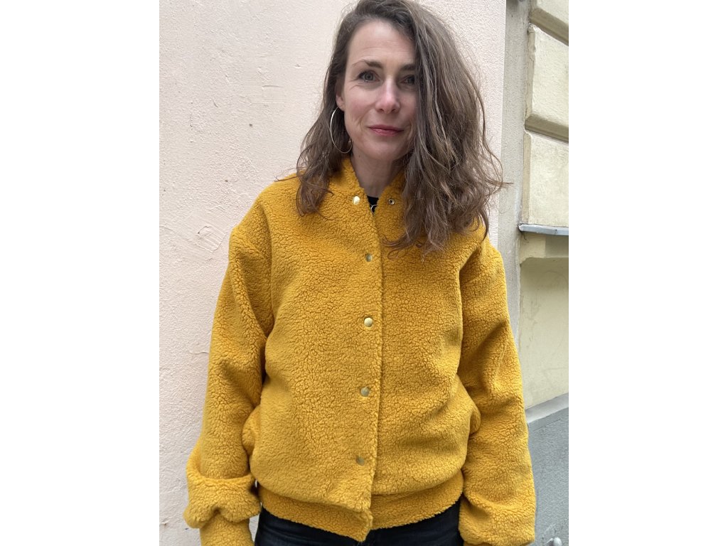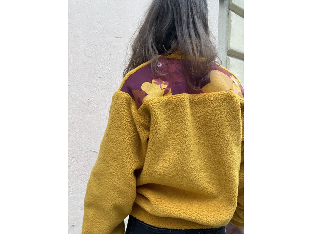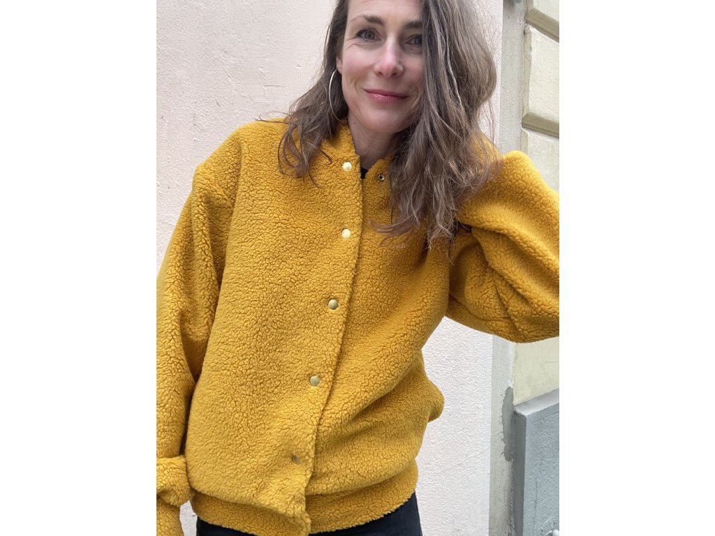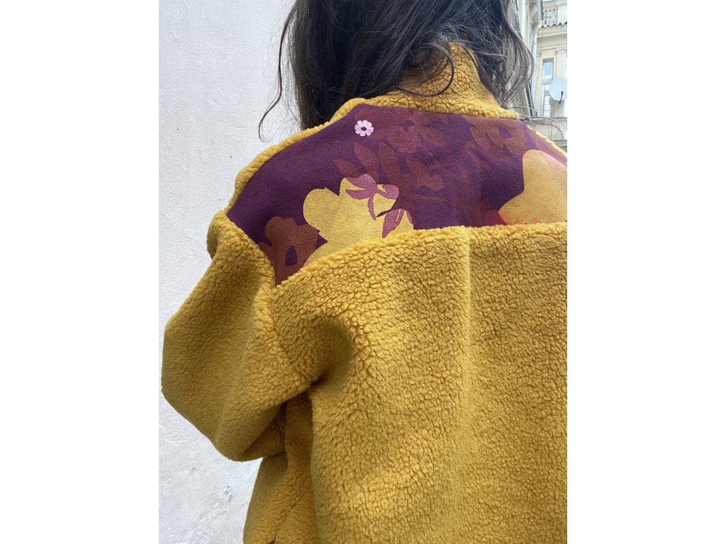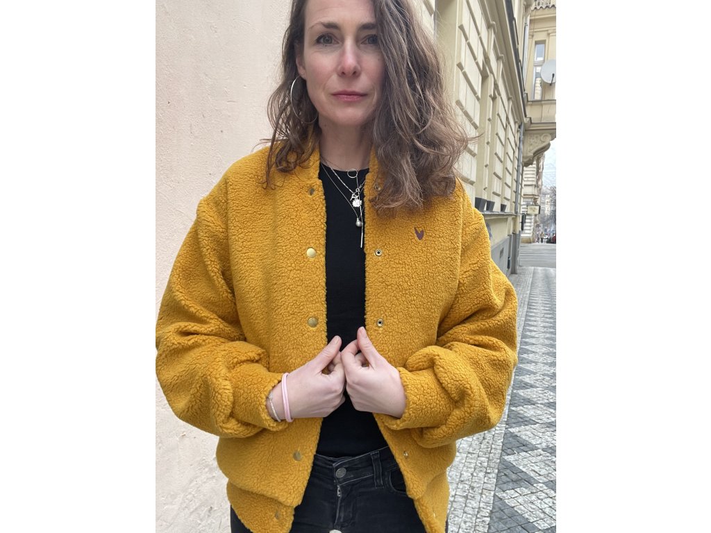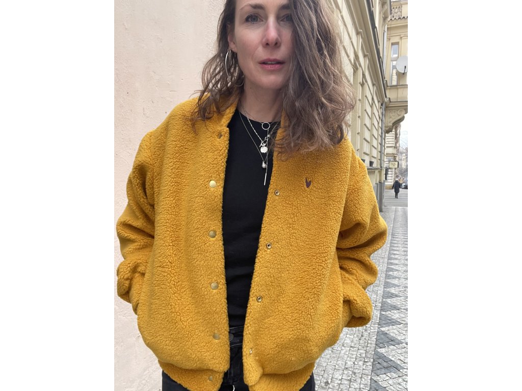 Bombr je z hořčicově žlutého fleecu, má hnědou podšívku a potištěnou teplákovou část zadního dílu, na předním díle výšivka, kapsy v bocích, zavírání na kovové patenty.