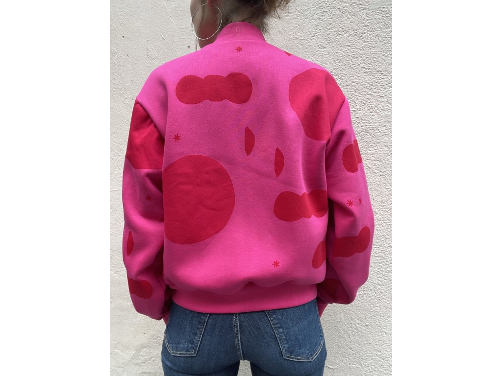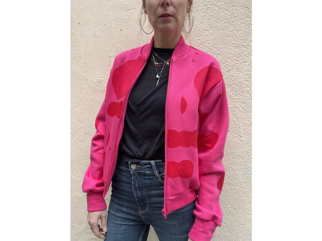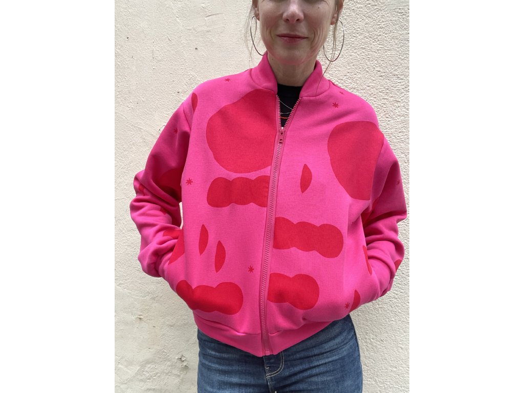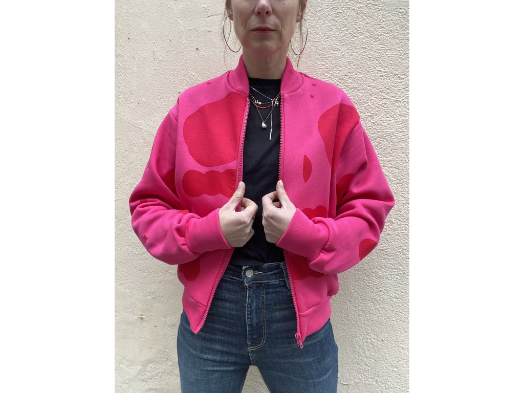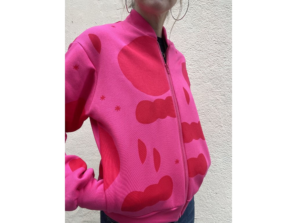 Bombr je ze zateplené teplákoviny, má červený potisk, zip, kapsy v bocích.Volný oversize střih.