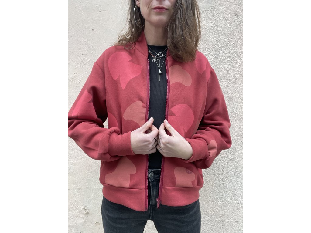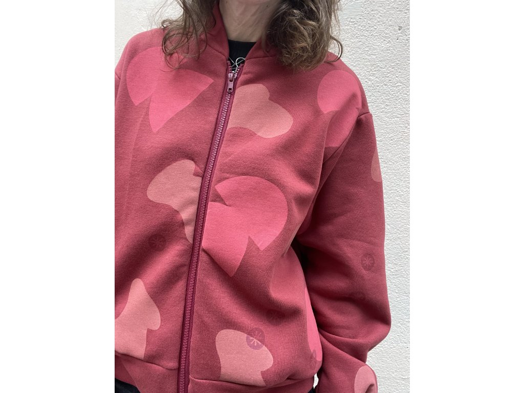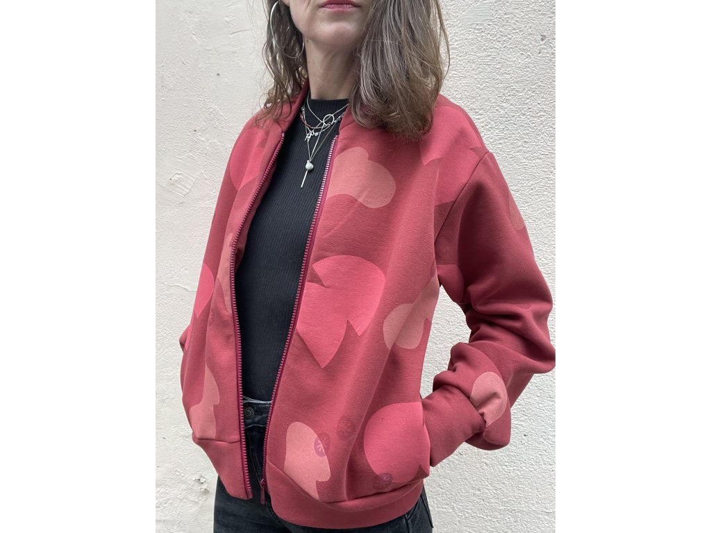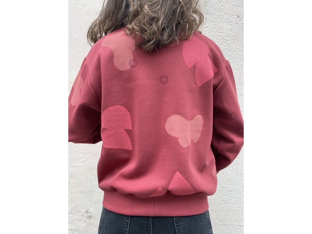 Mikina je z cihlové zateplené teplákoviny, má abstraktní barevný potisk, kapsy v bocích, volný střih.