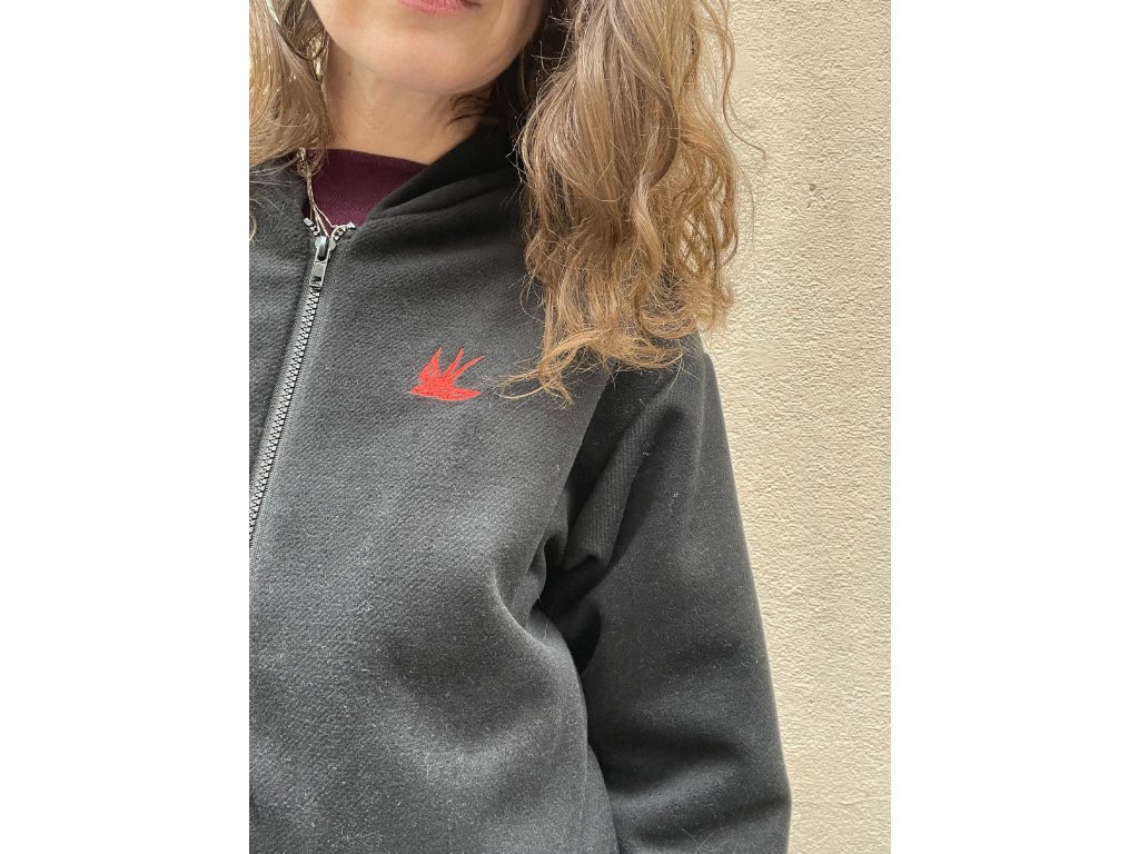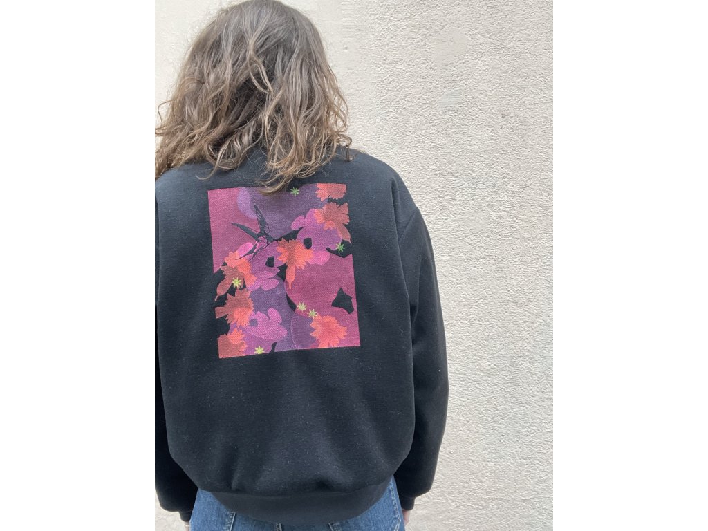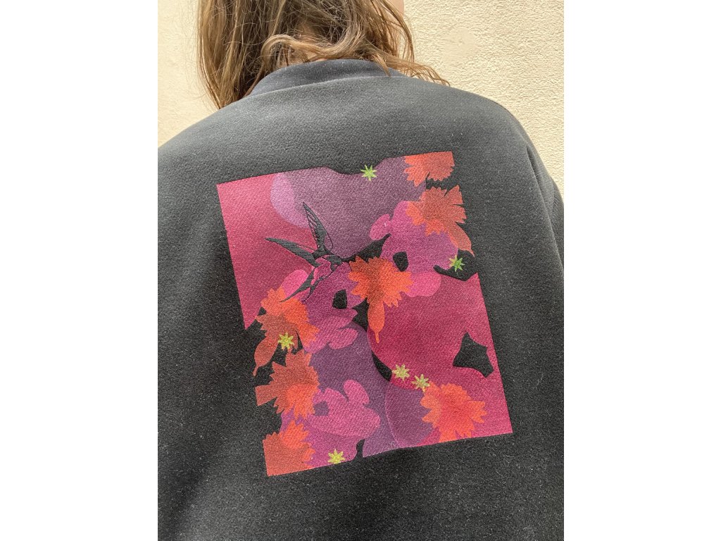 Bunda je z černé “semišové “ látky, v rubu koženka sv.hnědé barvy, volný oversize střih, kapsy v bocích, černé pružné lemování, barevný tisk a černá výšivka na zádech, pink výšivka na prsu.