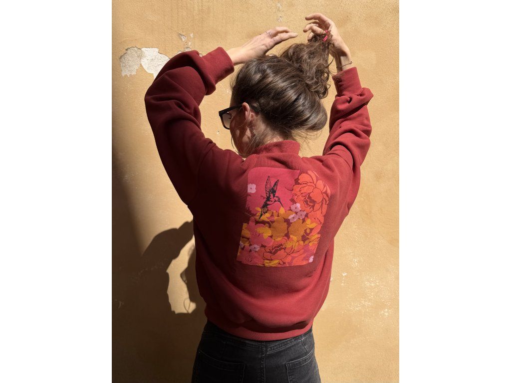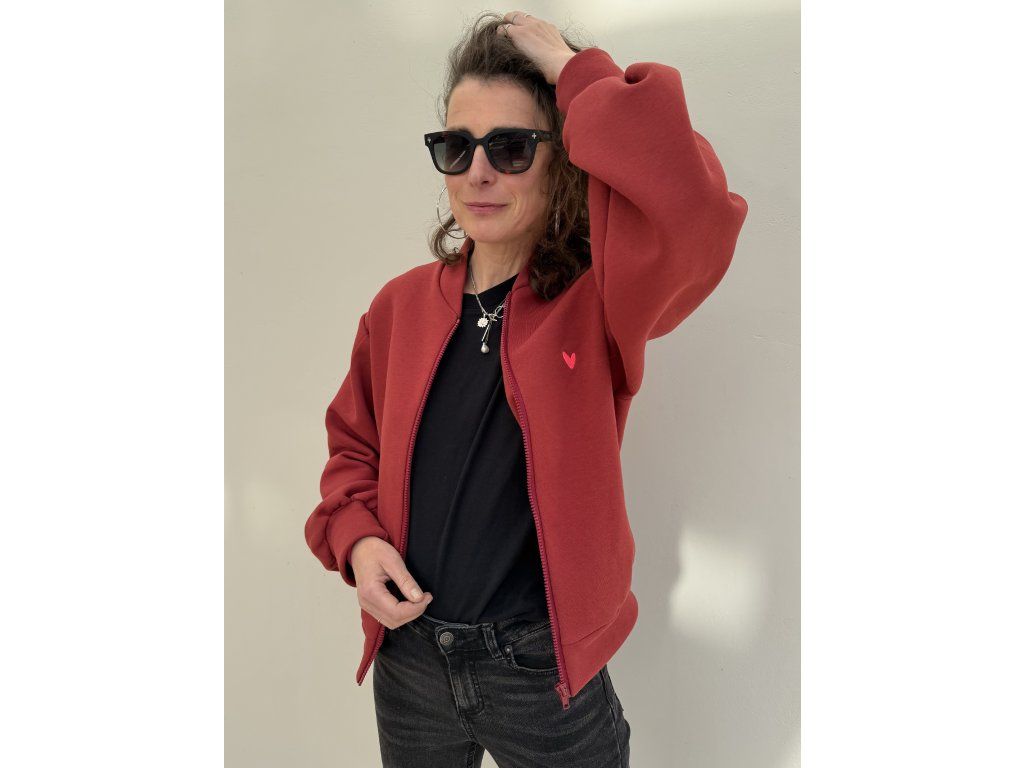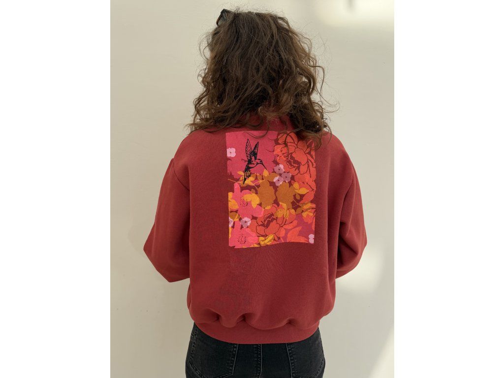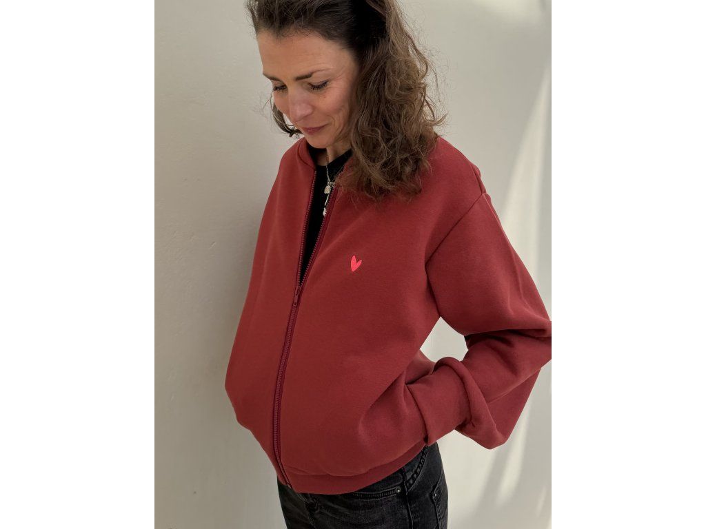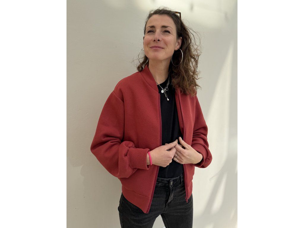 Bombr je z cihlové zateplené teplákoviny, má kapsy v bocích, výšivku na předním díle, na zadním díle barevný tisk a černá výšivka.