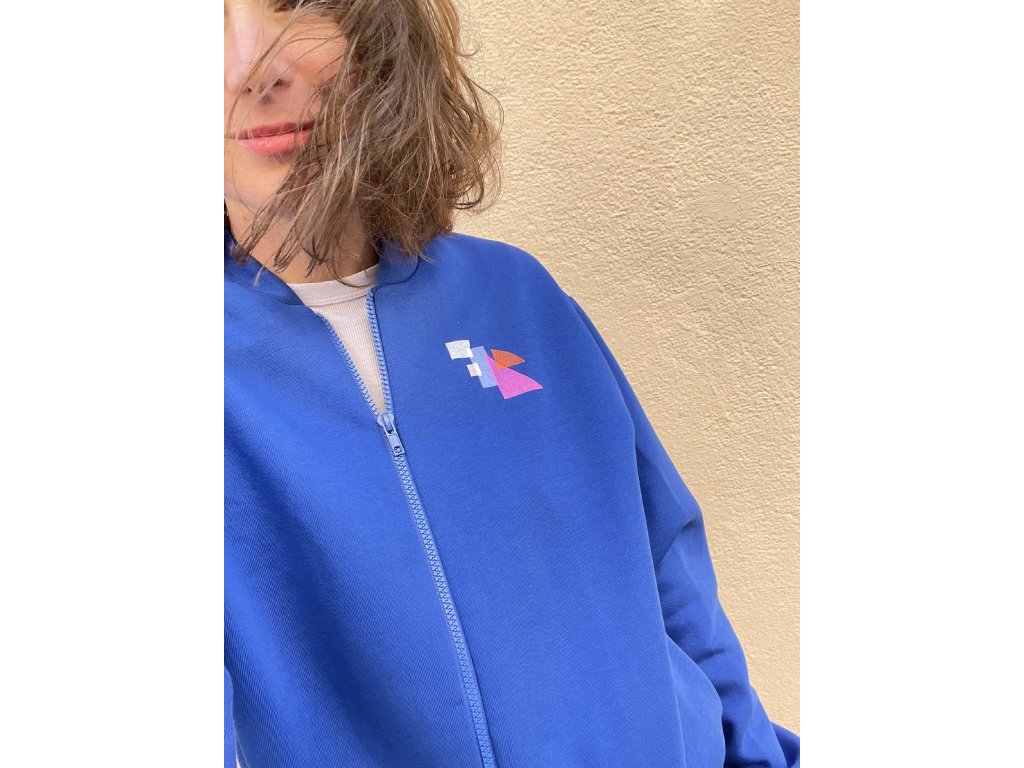 Mikina je z modré zateplené teplákoviny, má volný střih, kapsy v bocích, velký tisk na zádech.