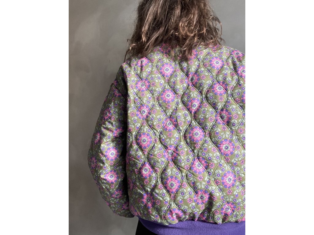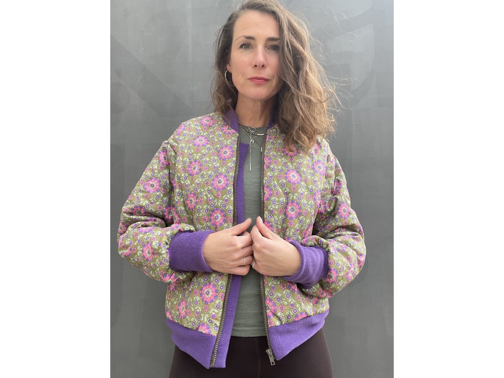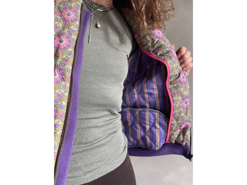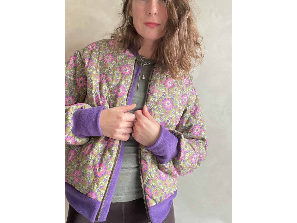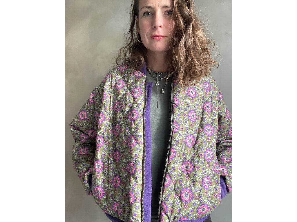 Bombr je ze vzorovaného proševu, má volný střih, fialové fleecové lemování a khaki zip, kspsy v bocích.