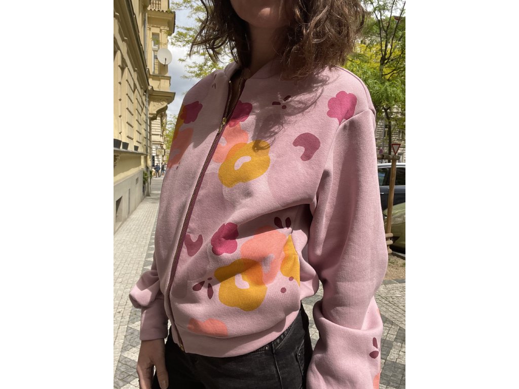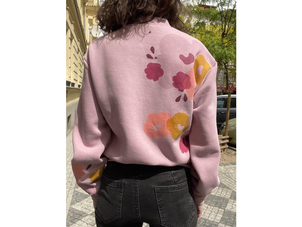 Mikina je ze zateplené teplákoviny, ma barevný potisk, volný oversize střih do pasu, kapsy v bocích.