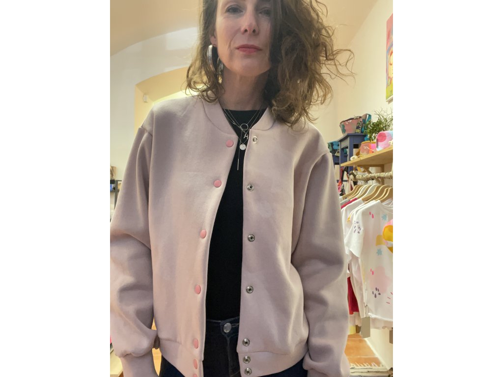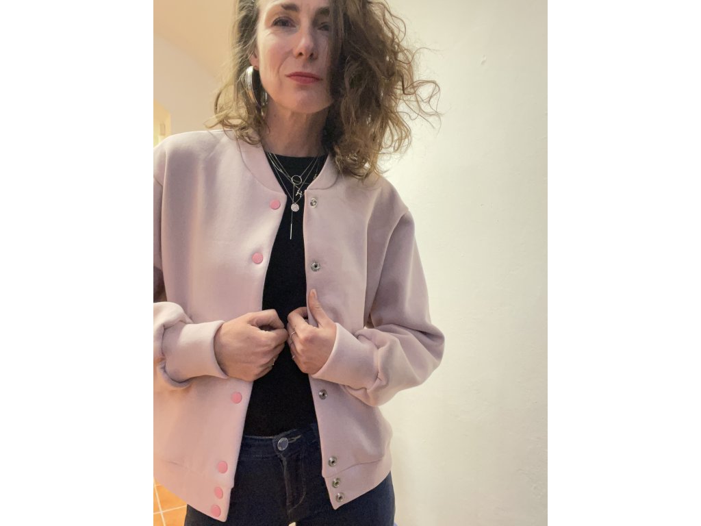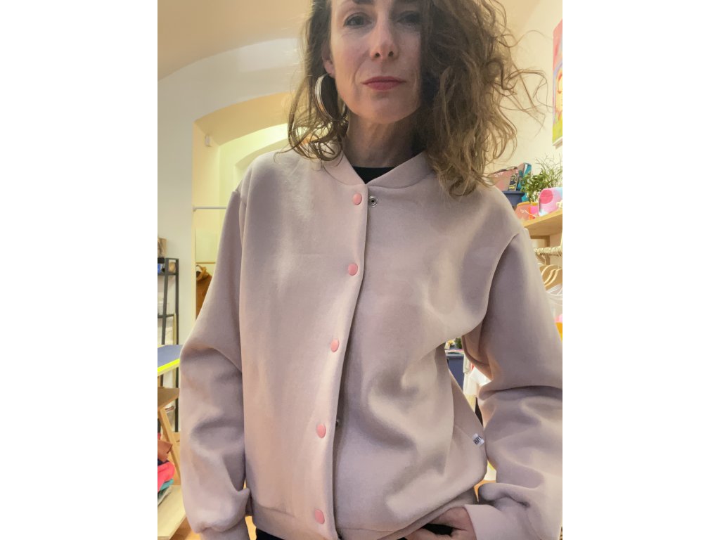 Mikina je ze zateplené teplákoviny, má volný oversize střih, zavírání na růžové patentky, potisk kytek tón v tonu