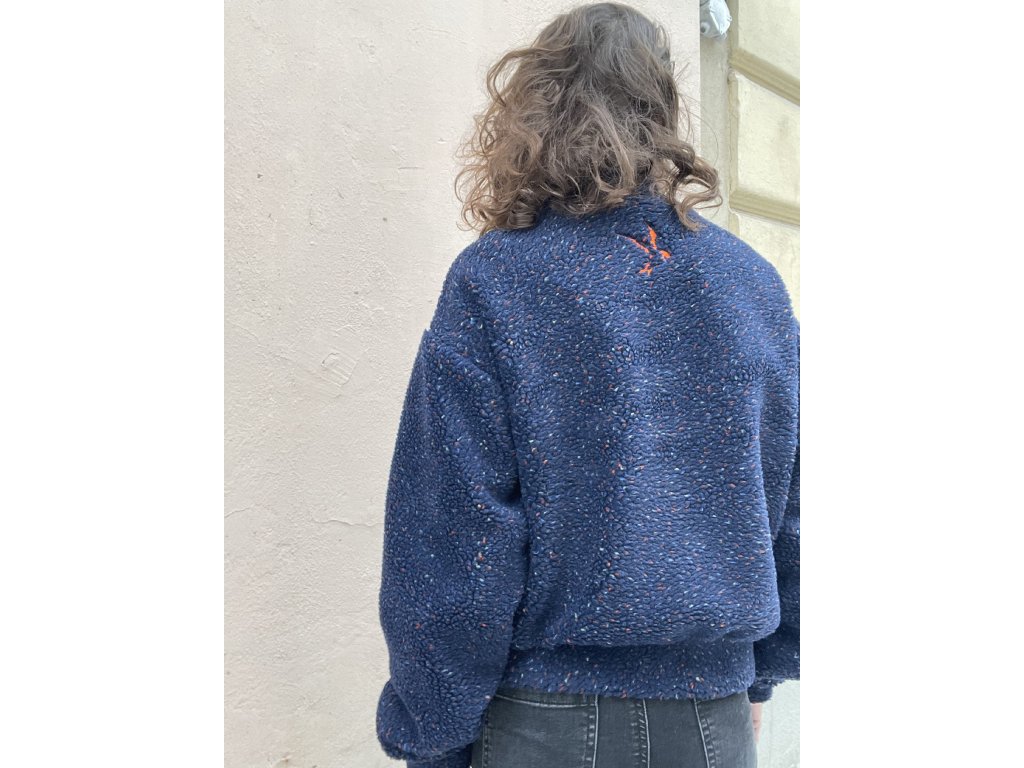 Bunda je z modrého beránka, má volný oversize střih, kapsy v bocích, neon oranž výšivky a patku u zipu, šedá podšívka v rubu.