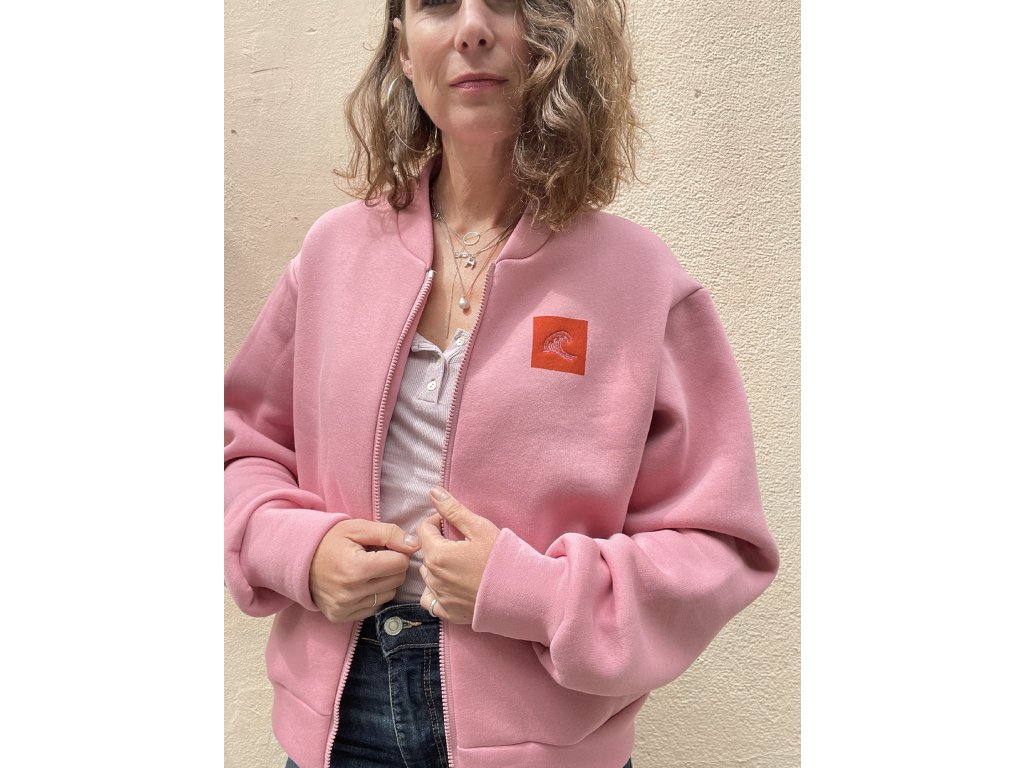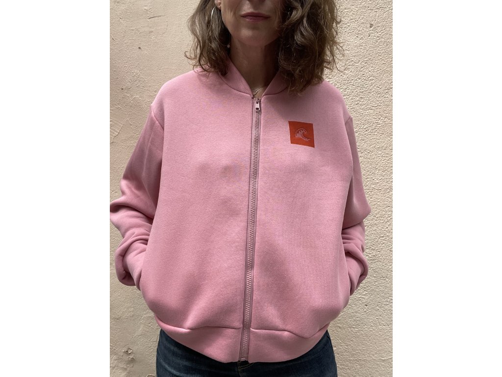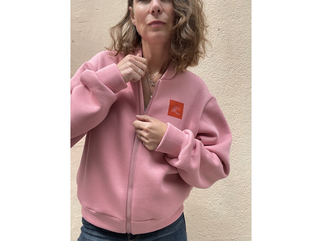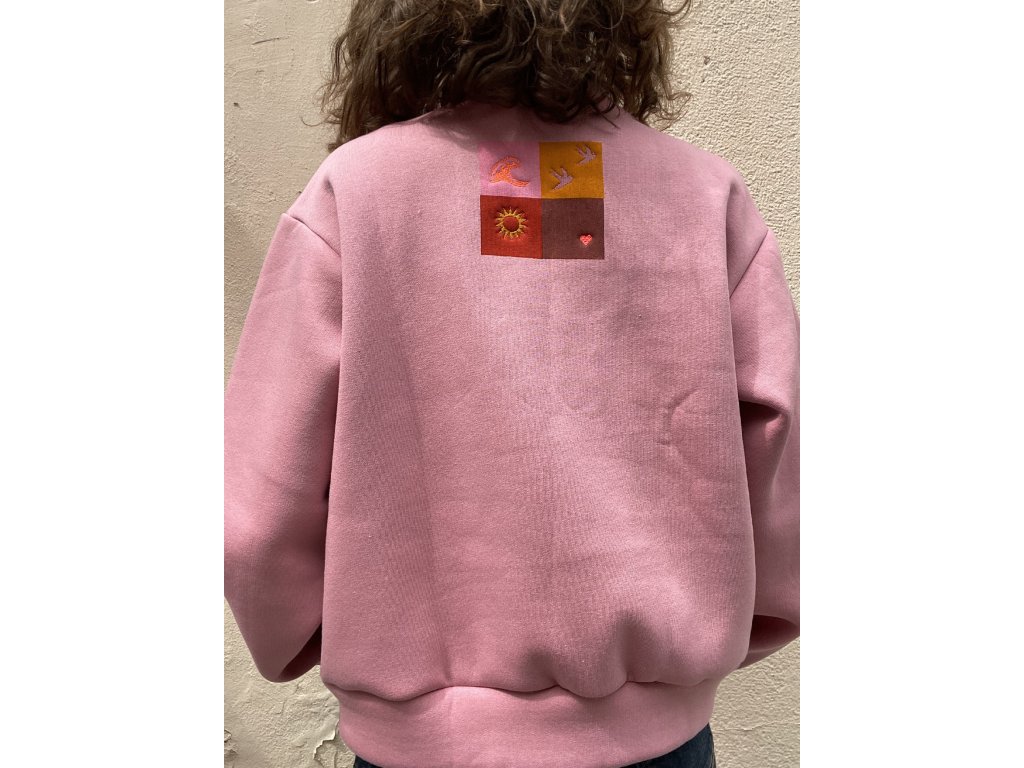 Mikina je ze zateplené teplákoviny, starorůžové barvy, má volný oversize střih, tisk a výšivky na předním i zadním díle.Kapsy v bocích.velikost: 38/40