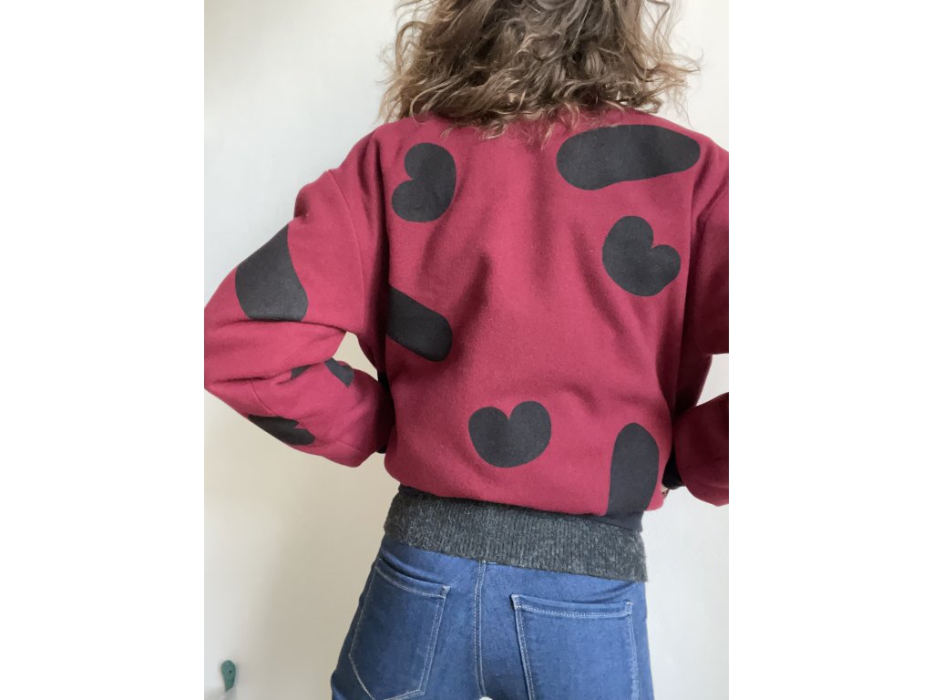 Bunda je ze zatepleného, vínového flauše, má kapsy v bocích, černé lemování, černý potisk, v rubové straně je vatelín s lila látkou…