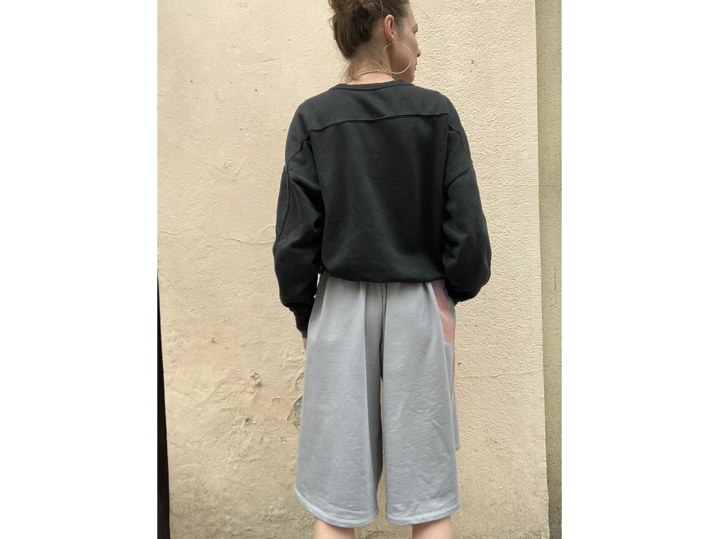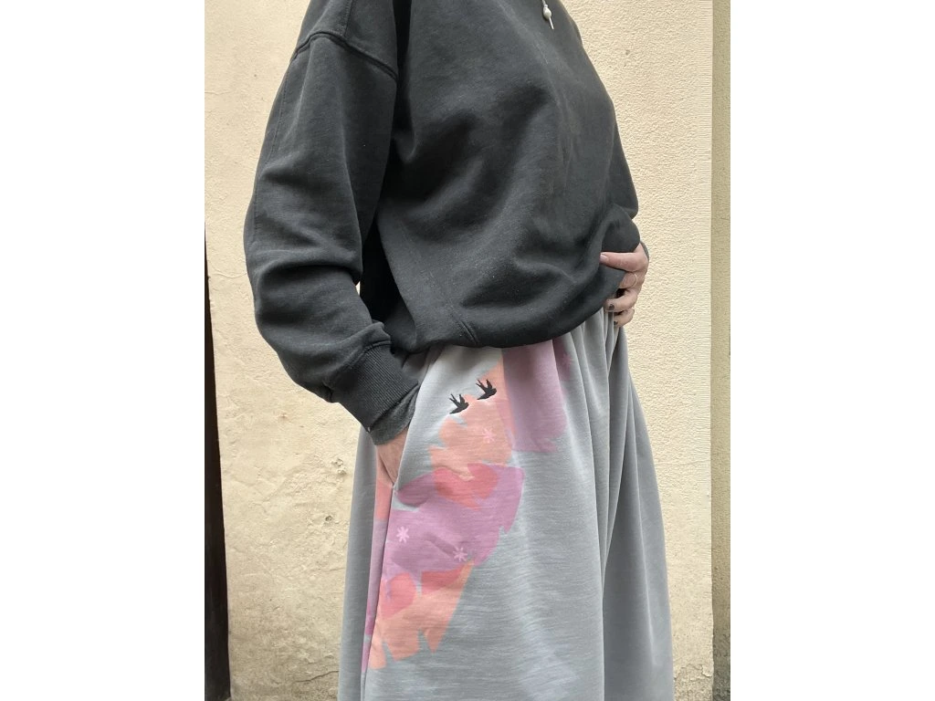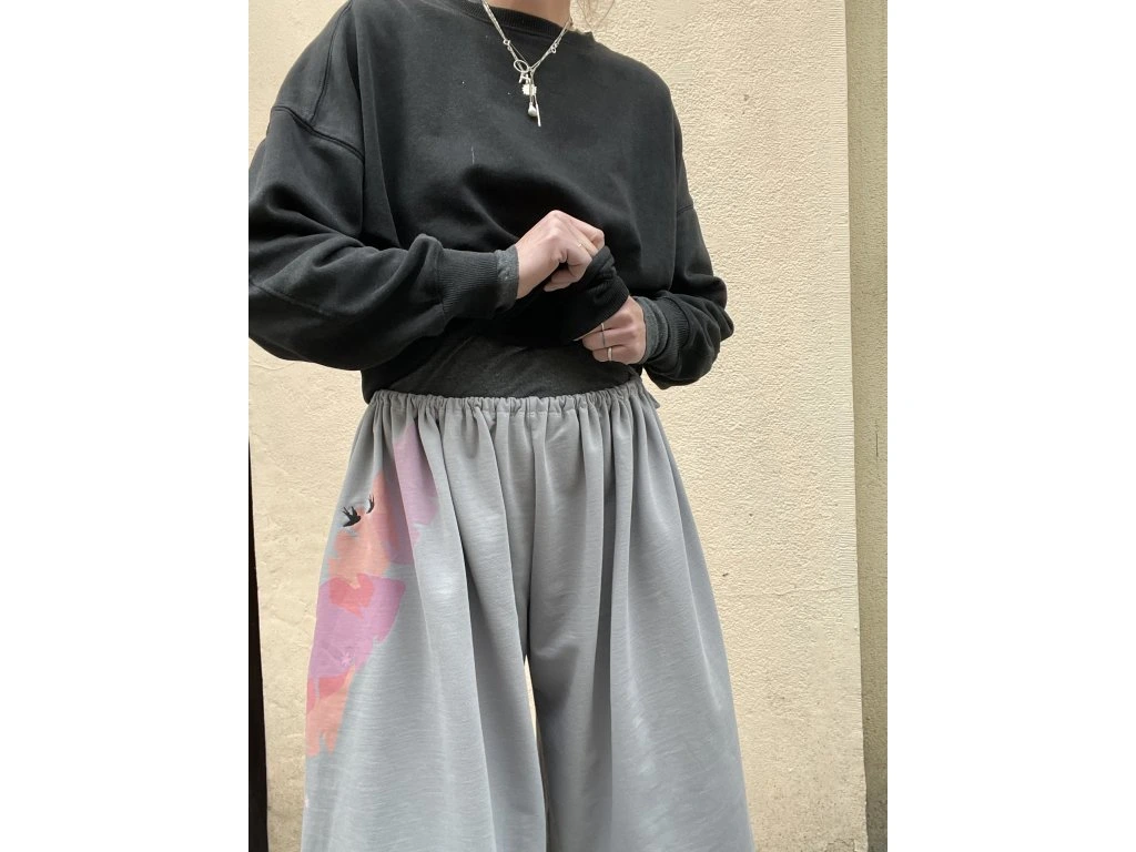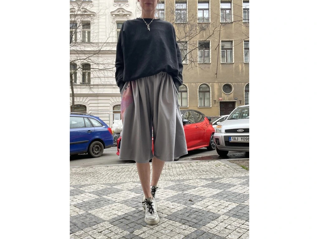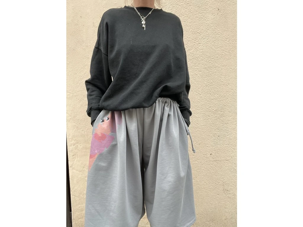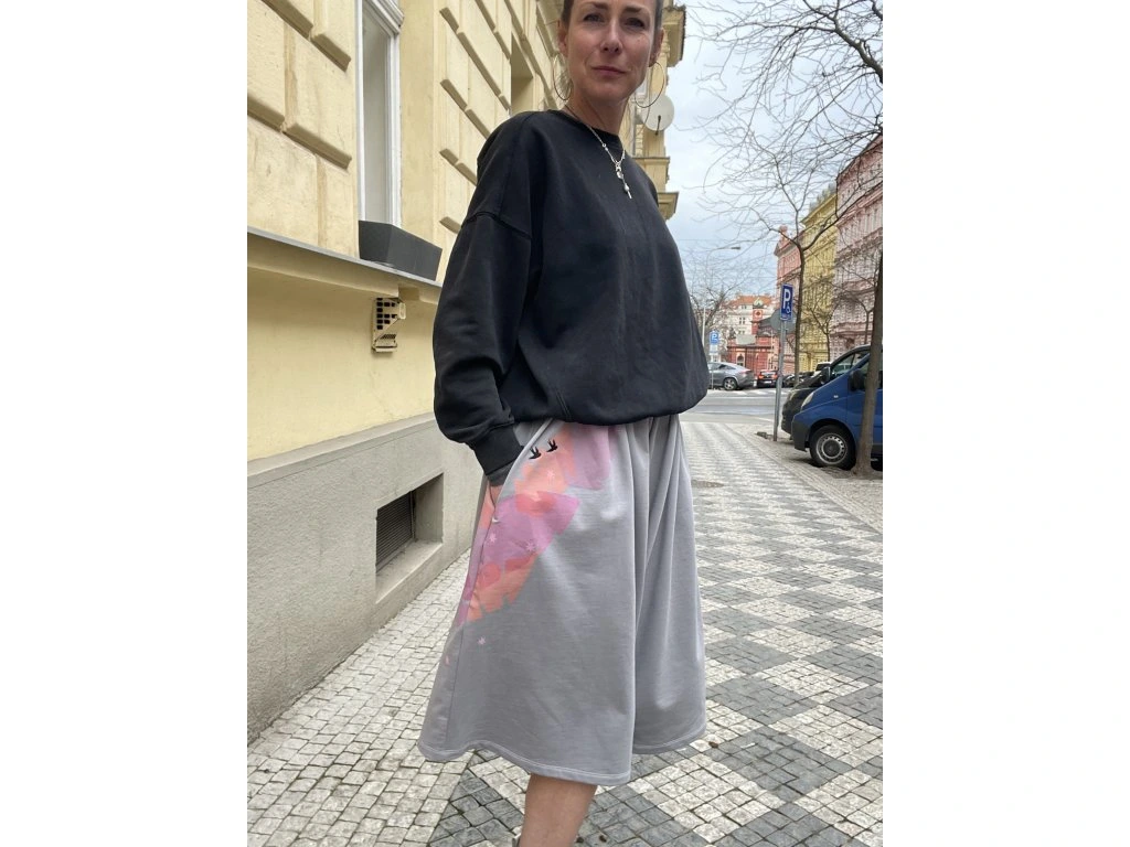 3/4 kalhoty jsou z tenké sv.šedé teplákoviny s krátkým chlupem z rubu…mají potisk a černou výšivku, kapsy v bocích, v pase protažená šňůrka - vázání na boku.
