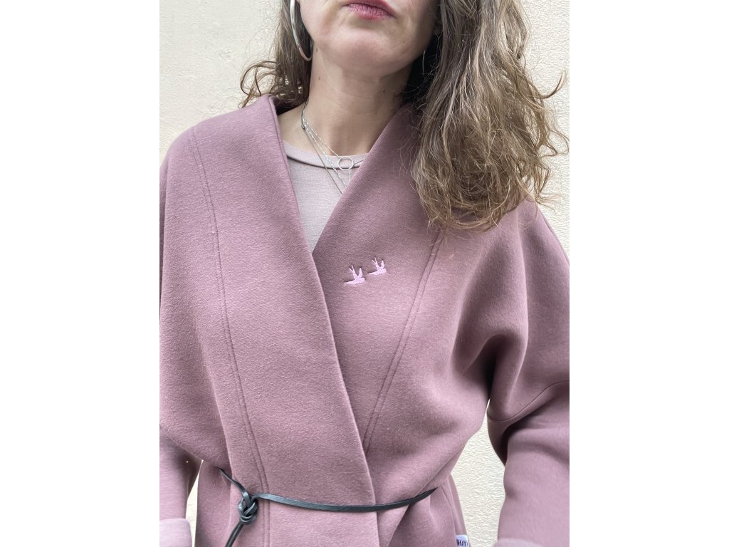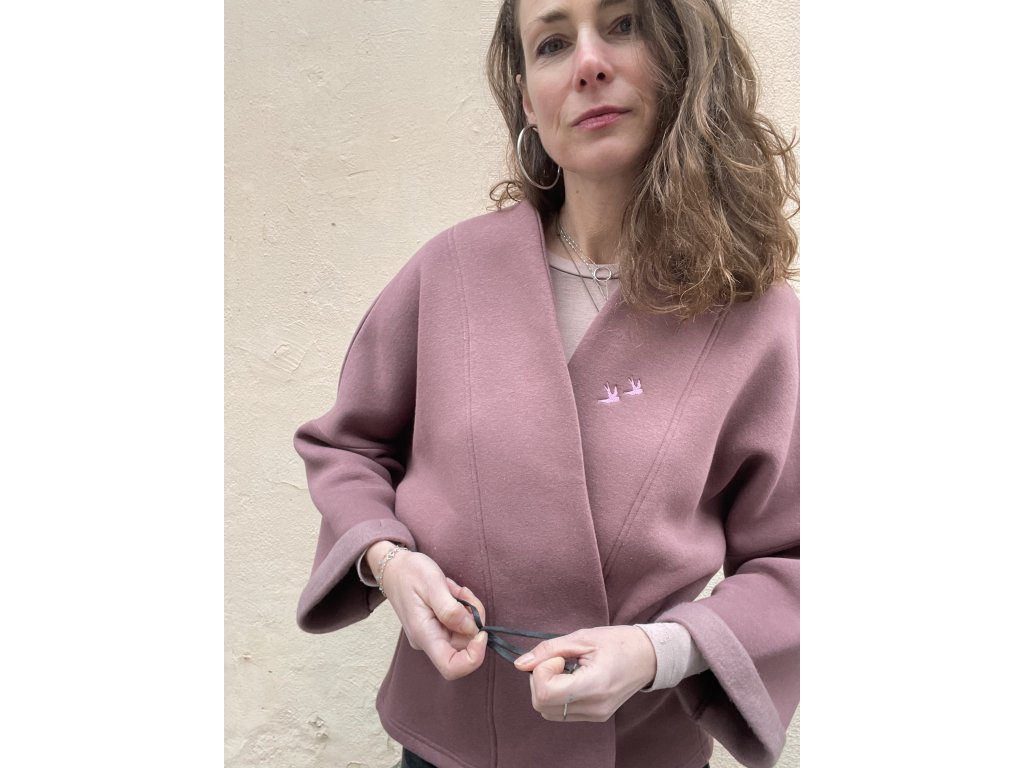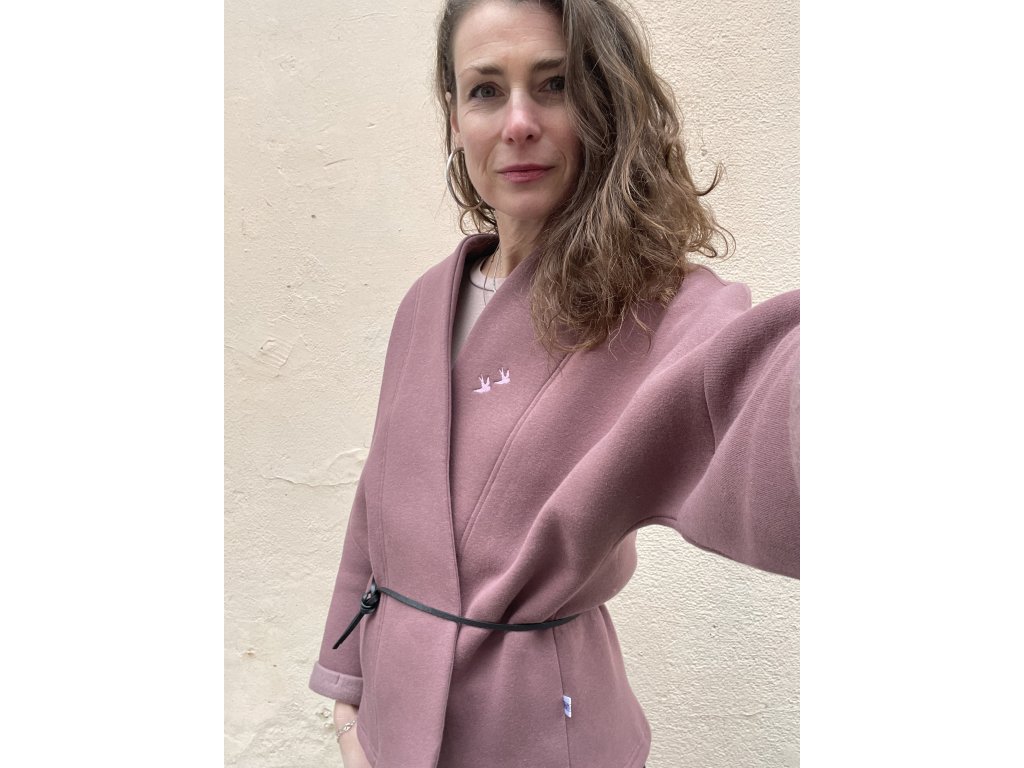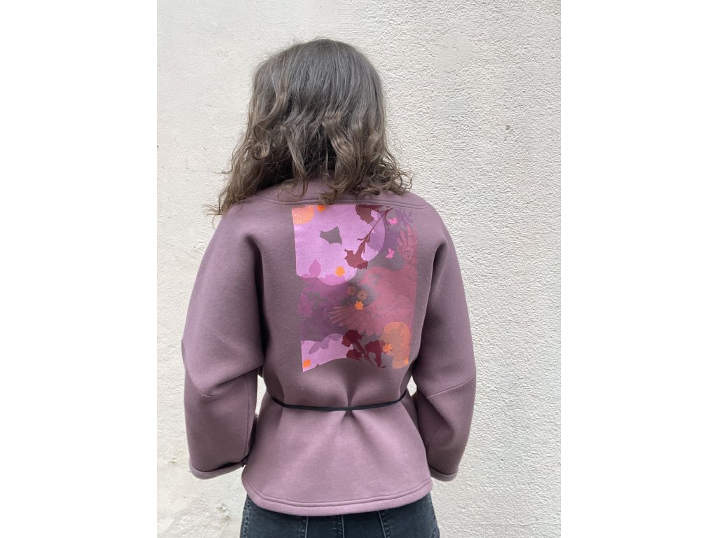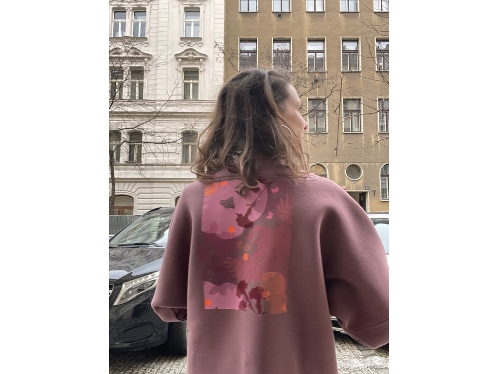 Kardigan je ze zateplené hnědo/vínové teplákoviny, má jemnou výšivku na předním díle, barevný tisk na zádech, kimonový střih…