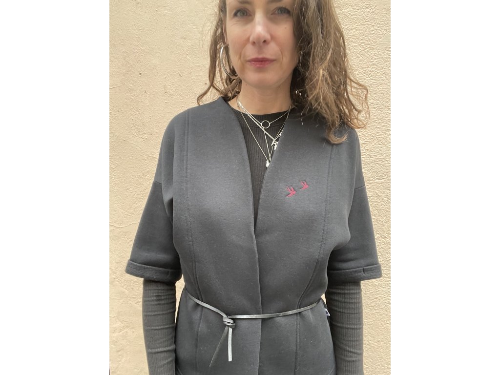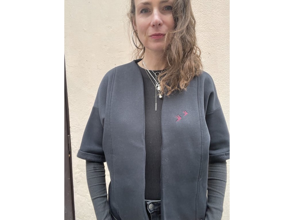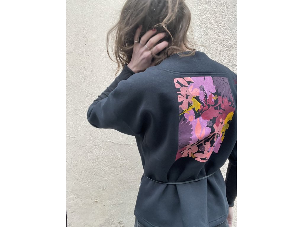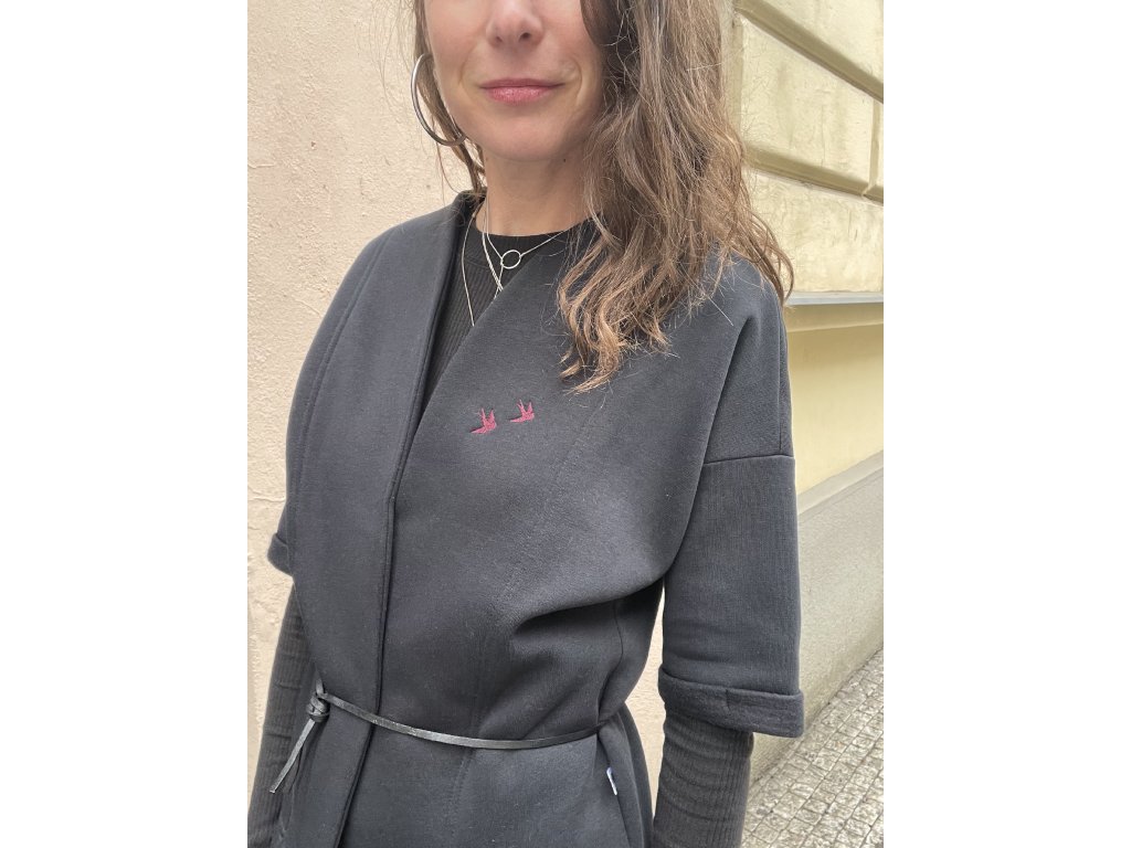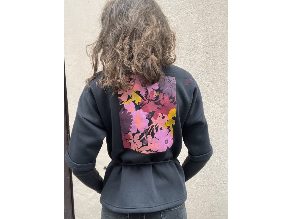 Kardigan je z černé zateplené teplákoviny, má bordo výšivku ptáčků, barevný tisk na zádech s černou výšivkou, kimonový střih, ohrnuté rukávky