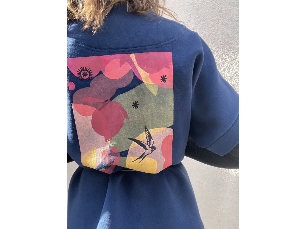 Kabátek je z tm.modré zateplené teplákoviny, má barevný tisk a výšivku na zádech, kimonový střih