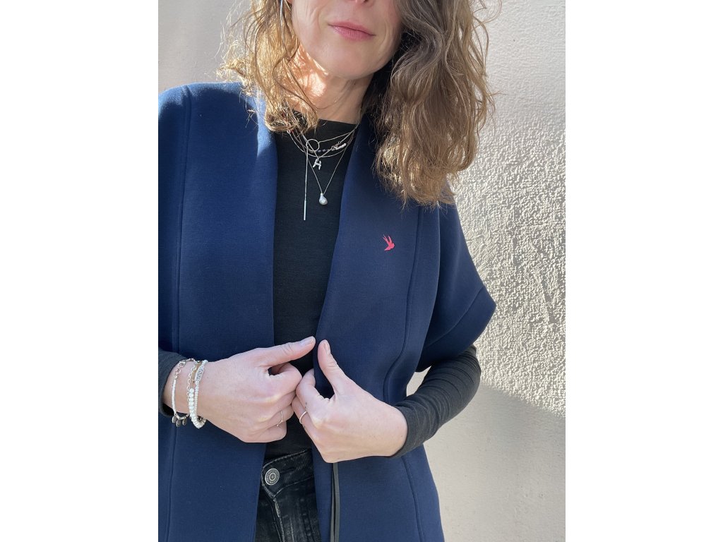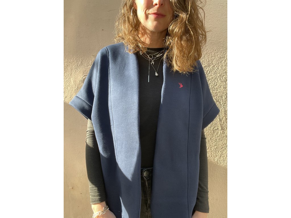 Tm.modrý kardigan s tiskem a výšivkou na zádech