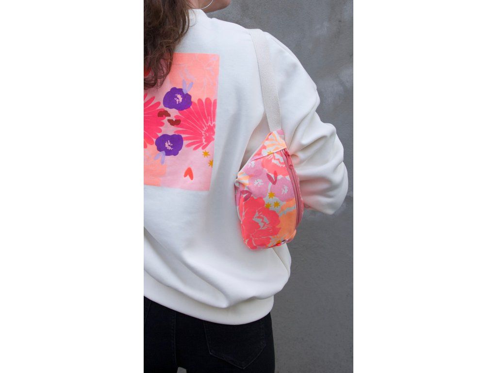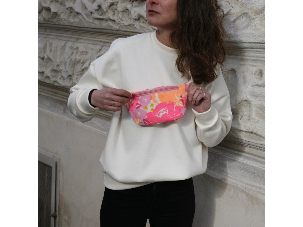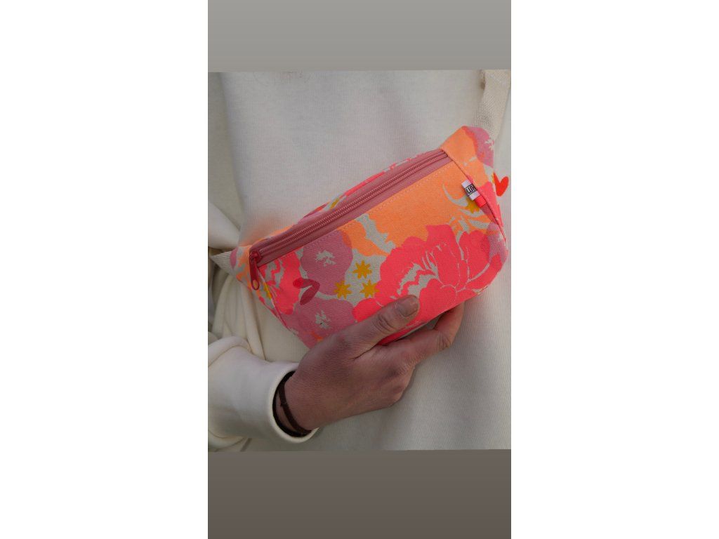 Ledvinka je z natur plátna, má barevný potisk, růžový zip, natur nastavitelný popruh.