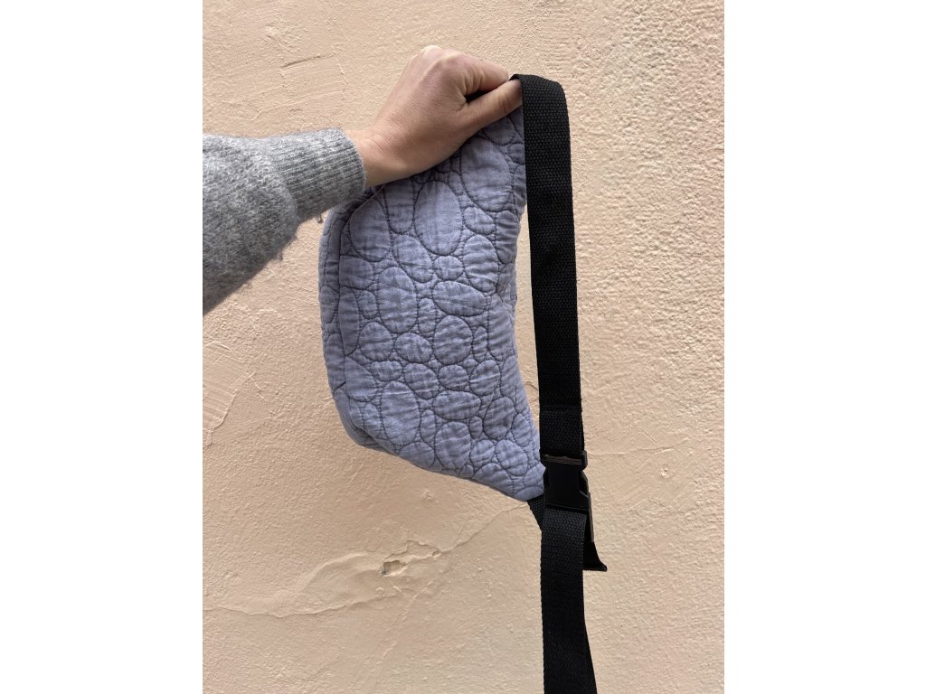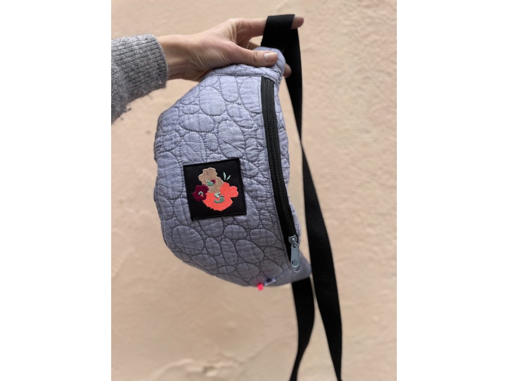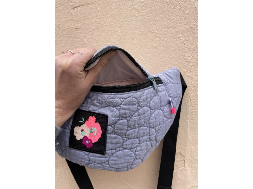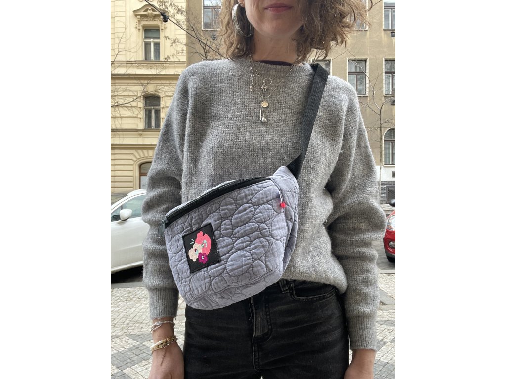 Ledvinka je z měkké prošité látky, rub z jemně růžového šusťáku, nášivka na přední straně, nastavitelný popruh.