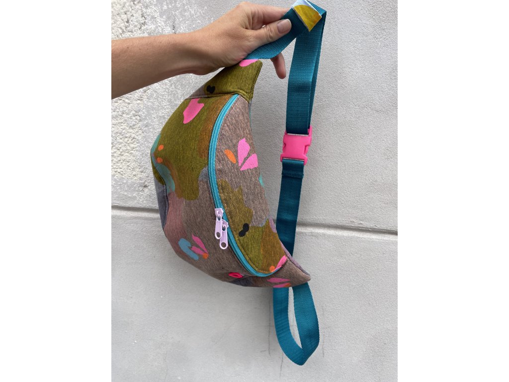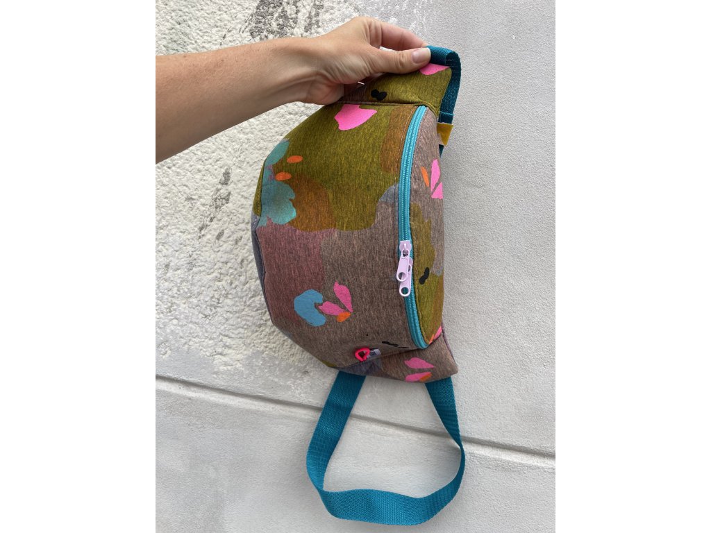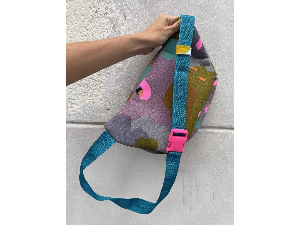 Ledvinka je z tenčí měkké šedé látky, má barevný potisk, vypodšívkovaný rub, nastavitelný popruh