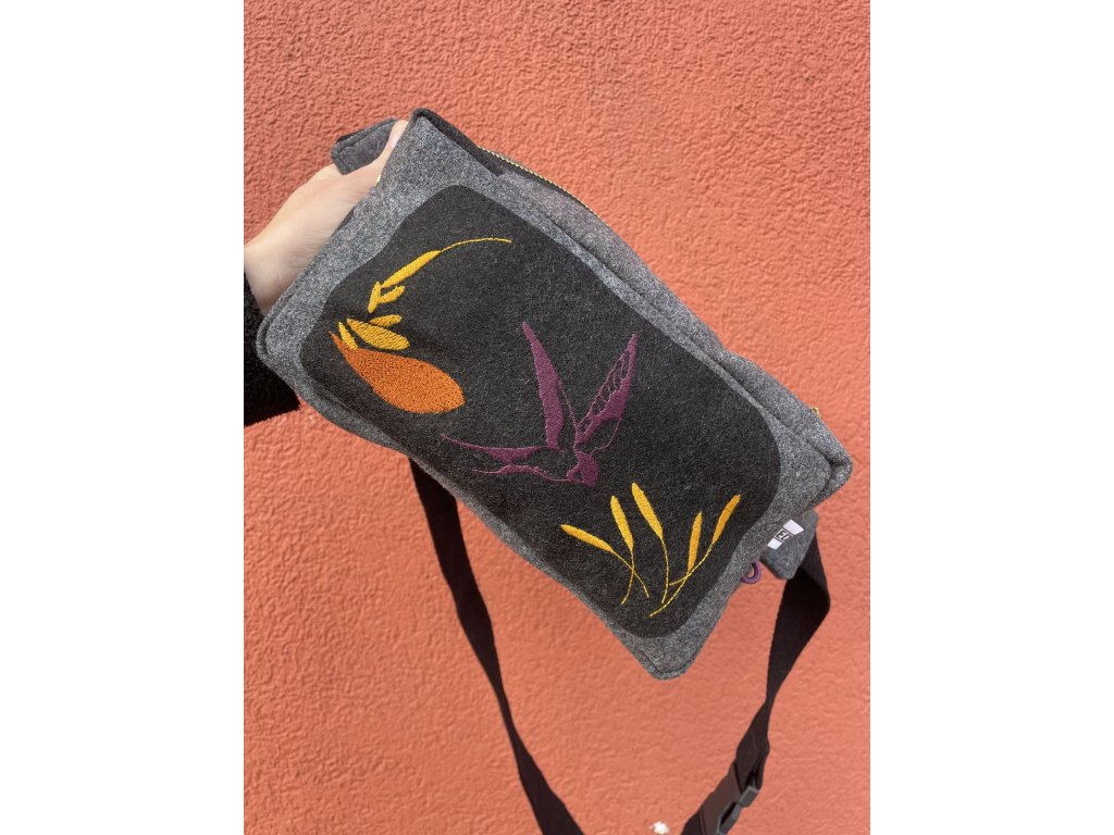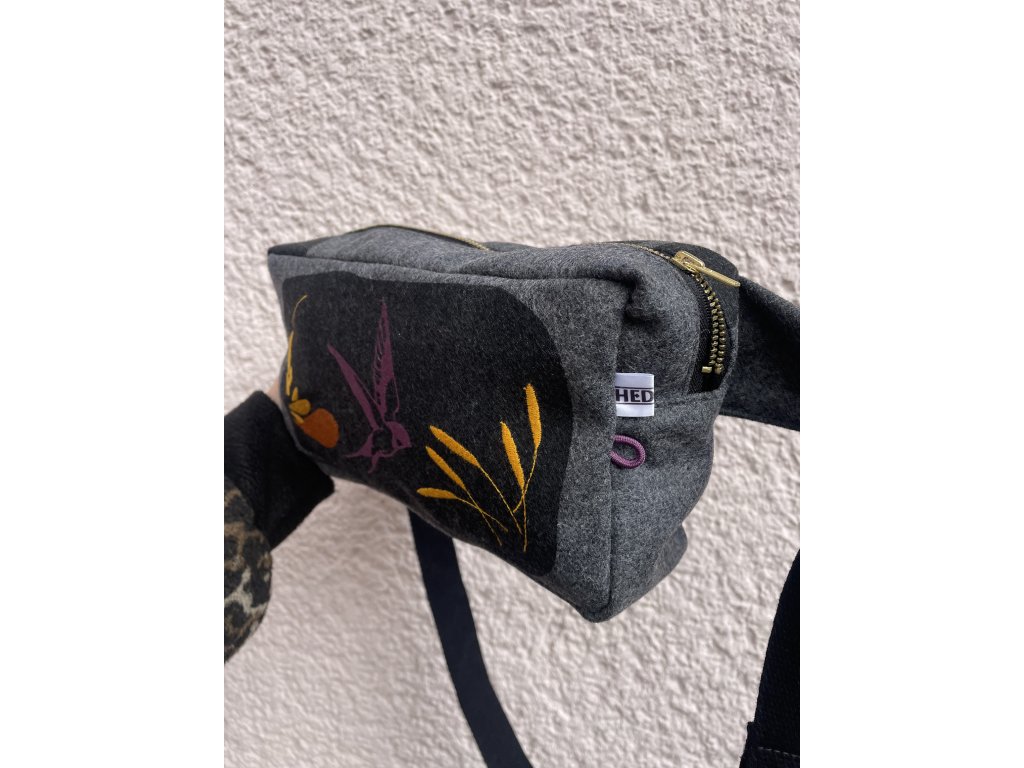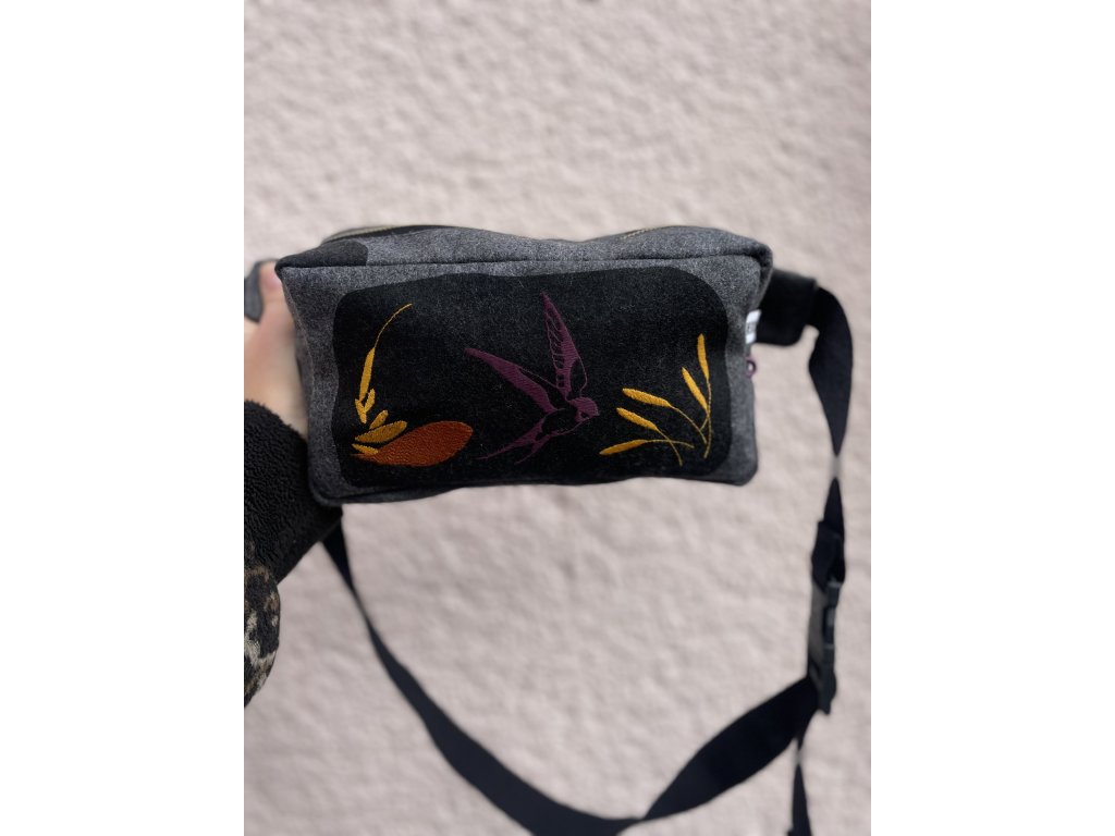 Ledvinka je z pevného a měkkého materiálu, má černý potisk, výšivku a kovový zip.Vnitřní kapsu. A nastavitelný popruh.
