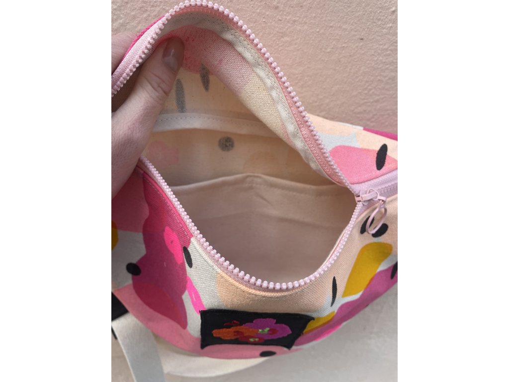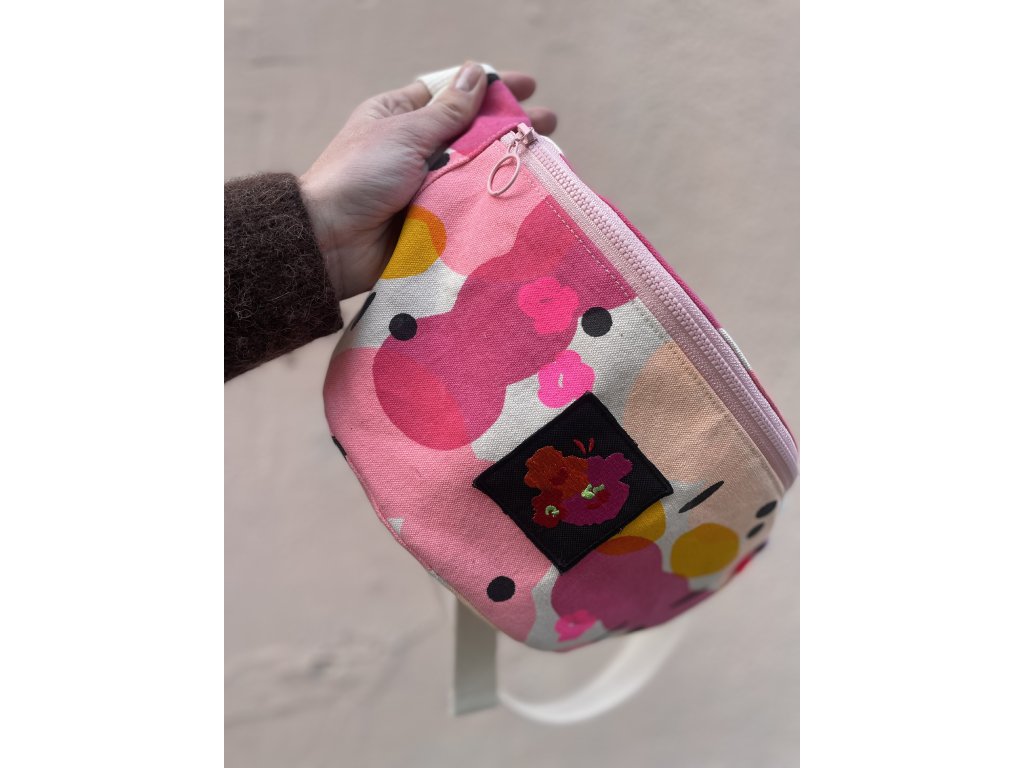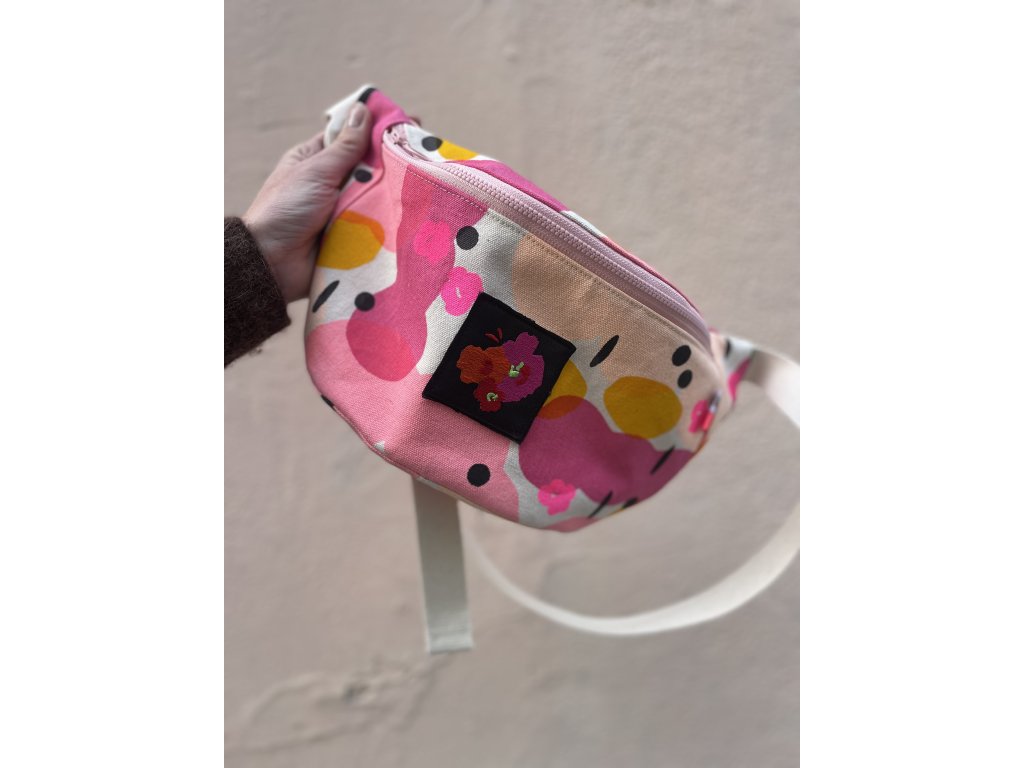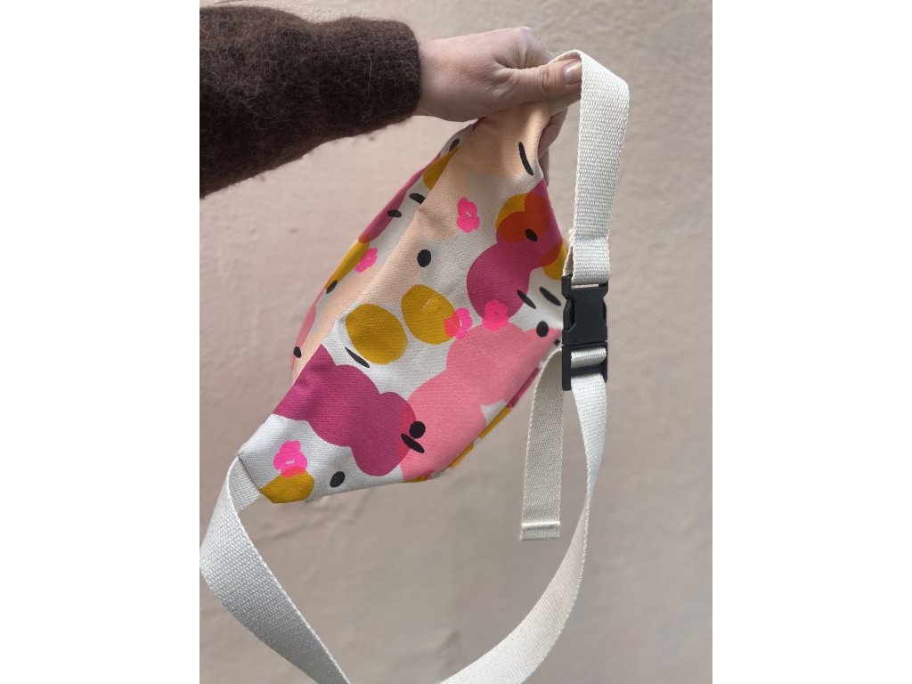 Ledvinka je z natur plátna, má na středu předního dílu nášivku, barevný potisk, natur nastavitelný popruh, vnitřní kapsa.