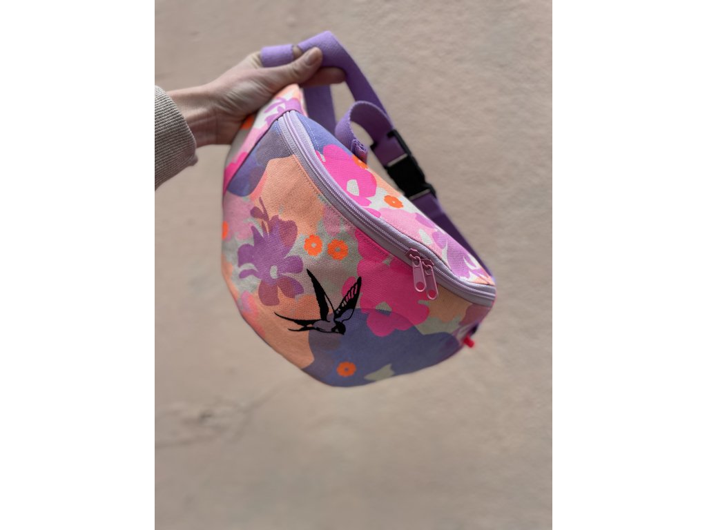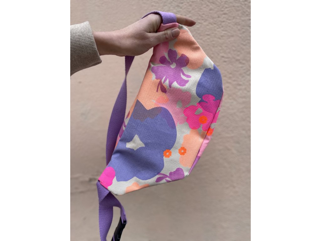 Ledvinka je z natur plátna s barevným tiskem a černou výšivkou, fialkový nastavitelný popruh.Černá spona