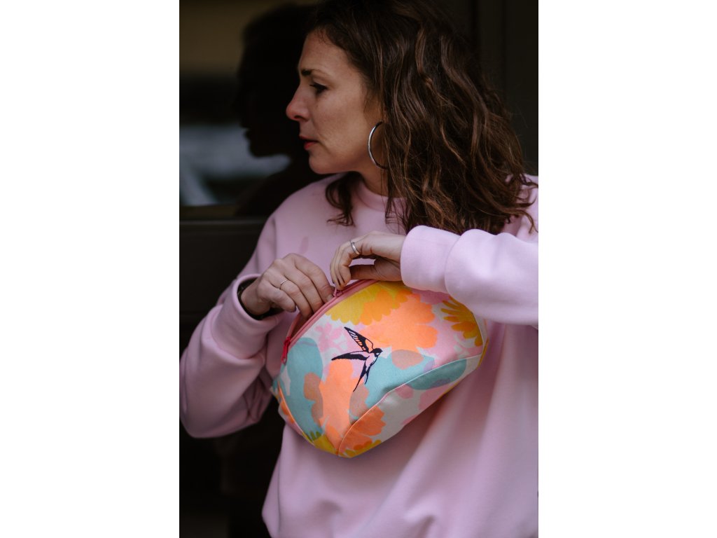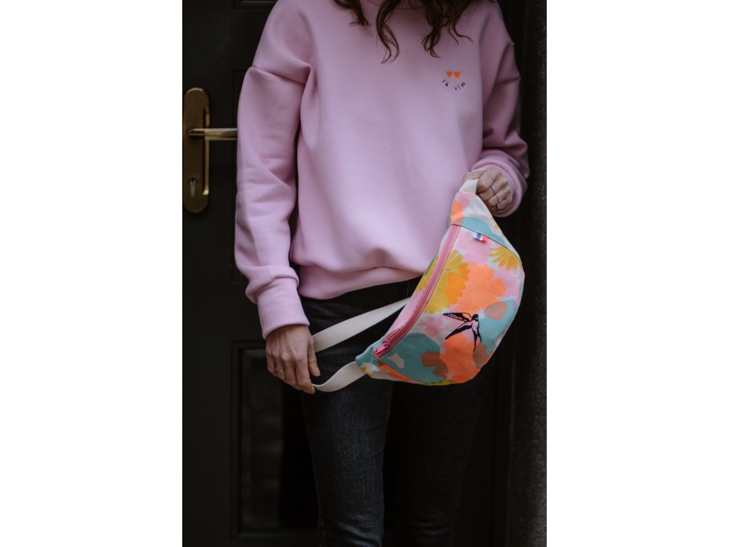 Ledvinka je z natur plátna s barevným tiskem a černou výšivkou, natur nastavitelný popruh, černá spona.