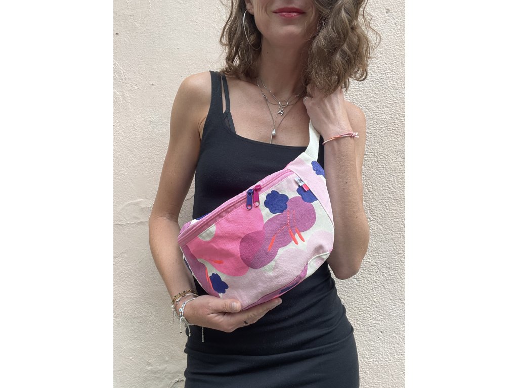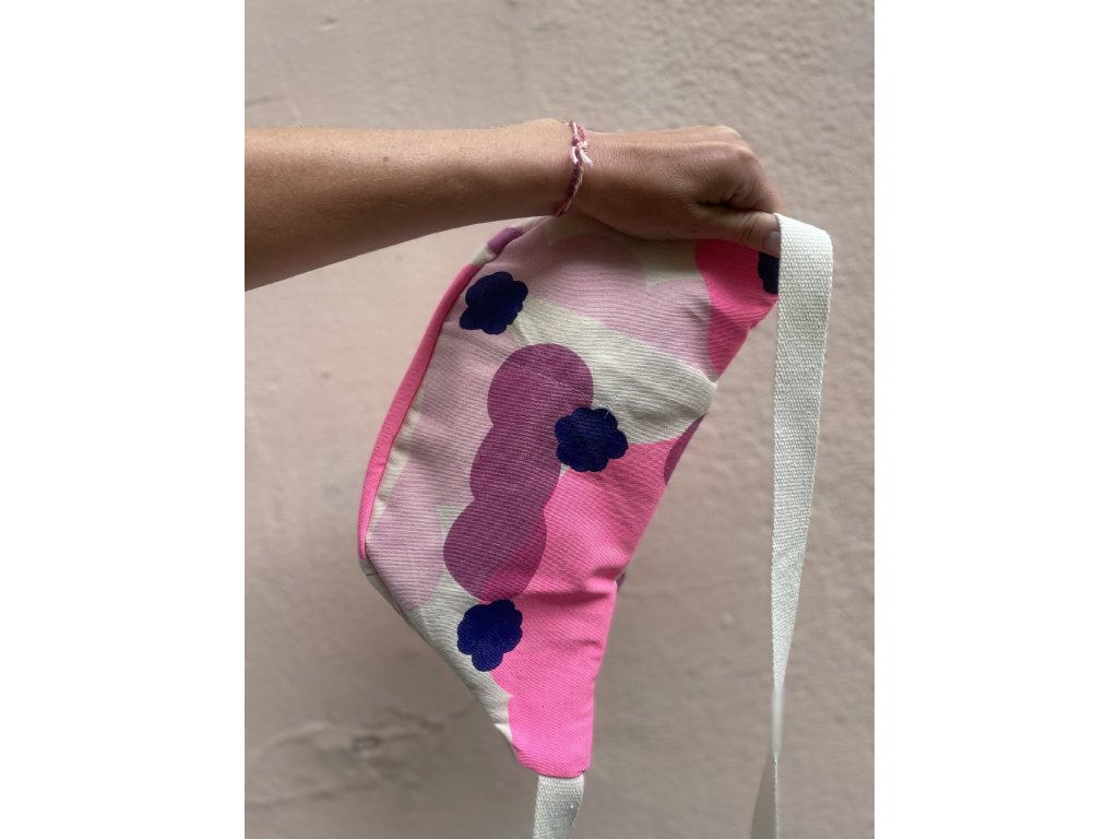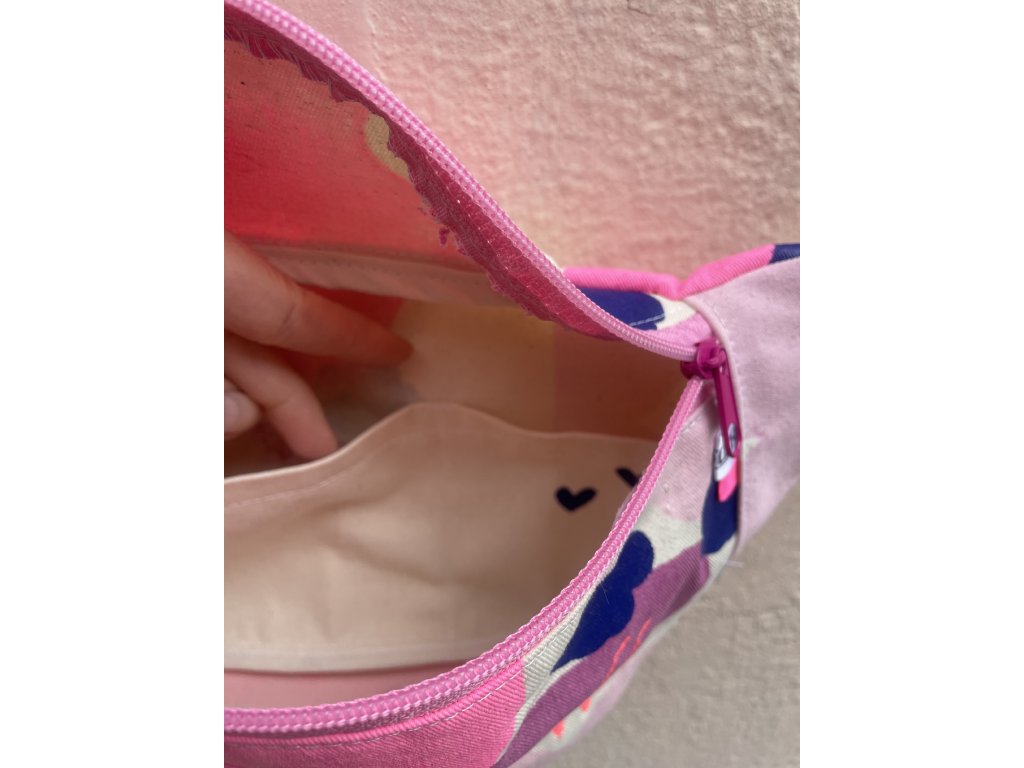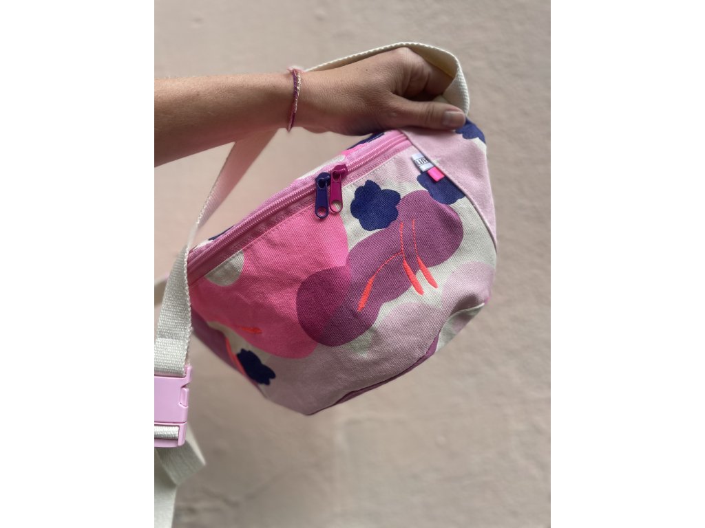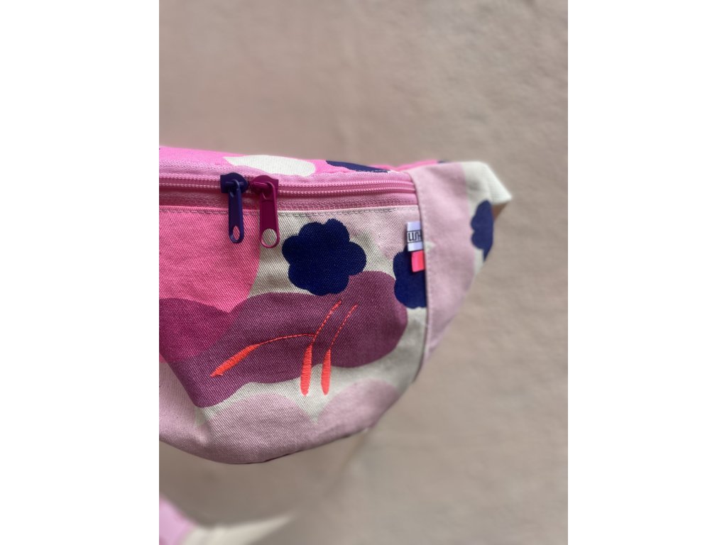 Ledvinka je z natur plátna, má barevný tisk a jasně růžovou výšivku, má vnitřní kapsu a nastavitelný popruh