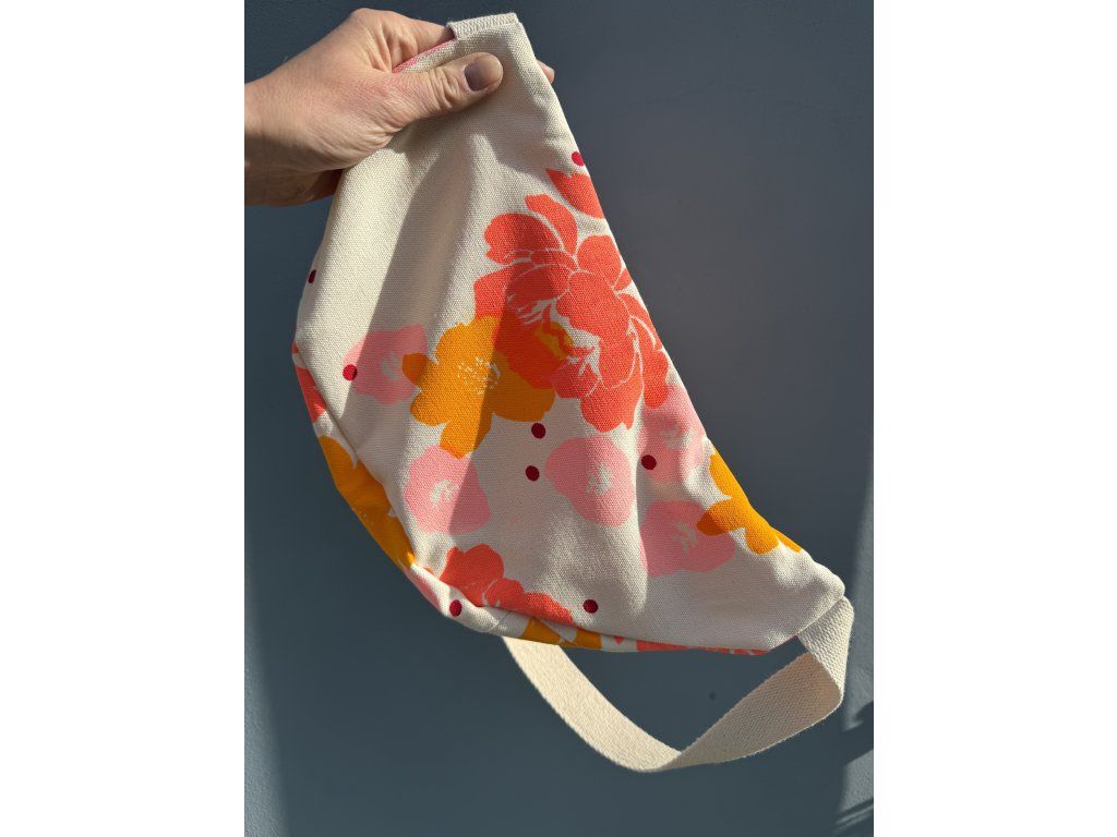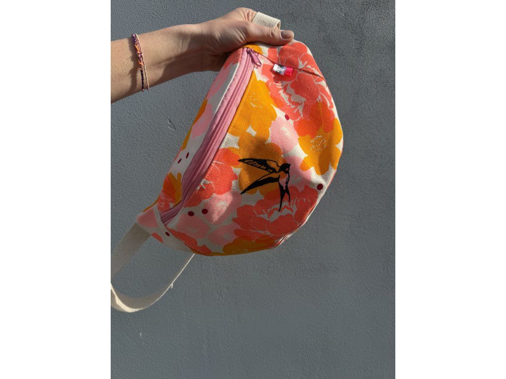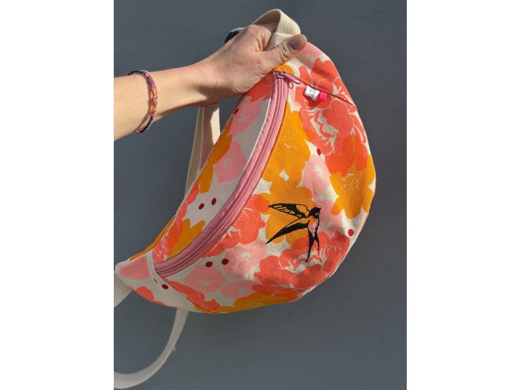 Ledvinka je z natur plátna s barevným tiskem a černou výšivkou, růžový zip, nastavitelný natur popruh.
