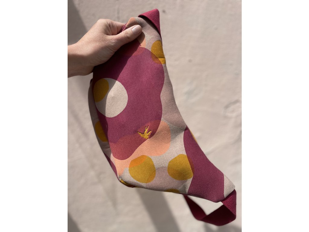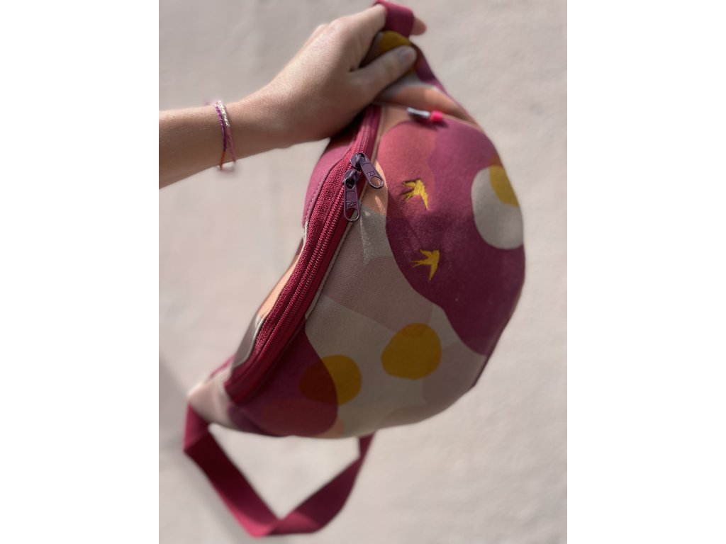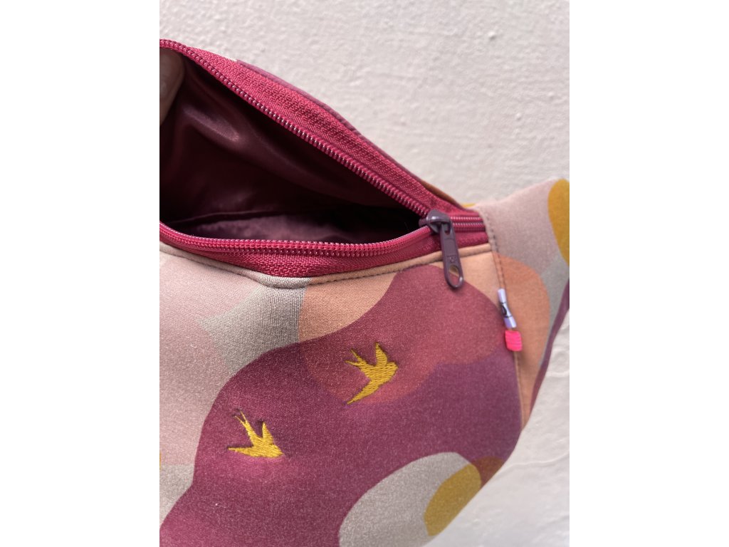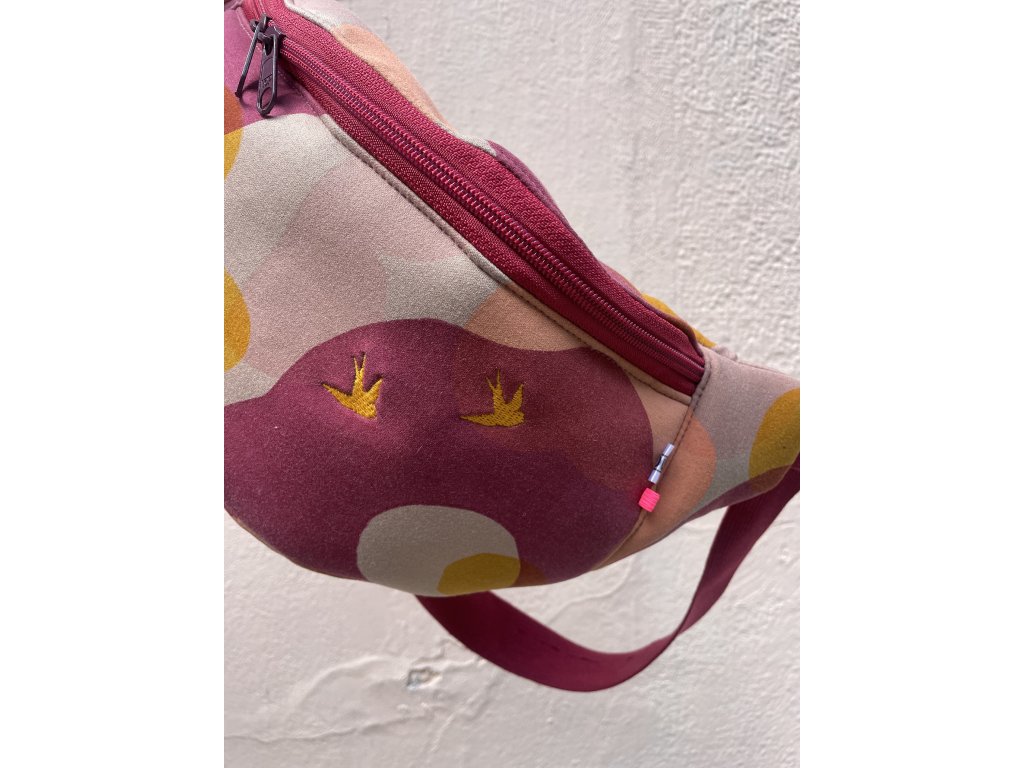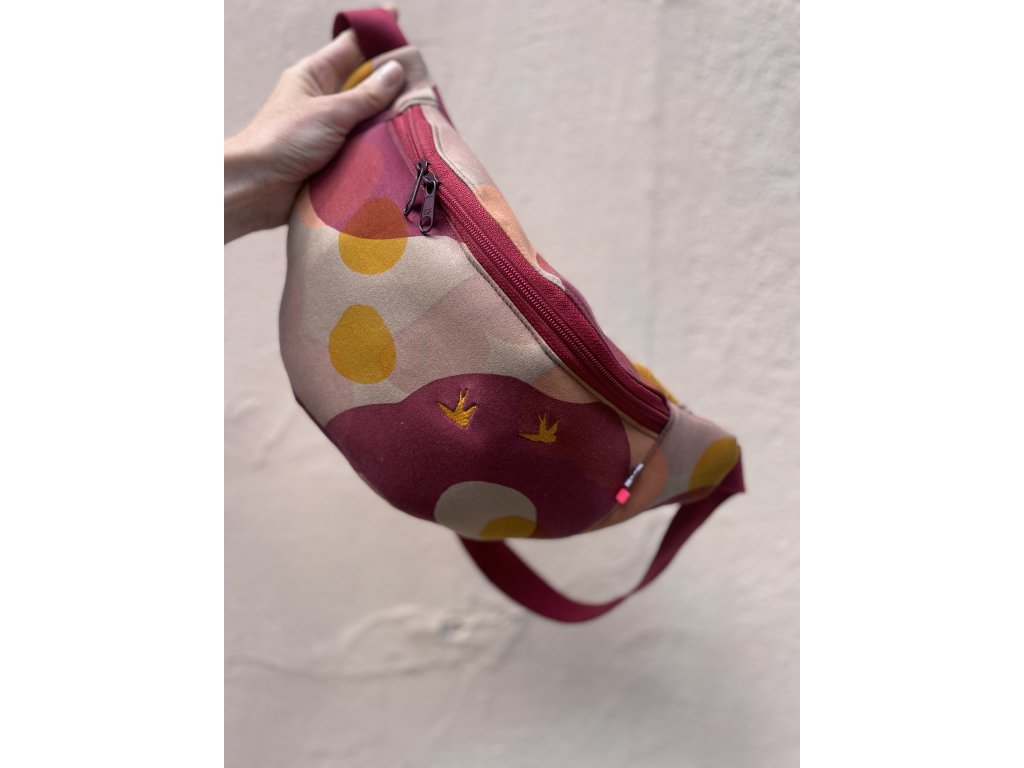Ledvinka je z měkké molitanové látky, má barevný potisk a výšivku na předním díle a mini vlaštovkou na zadním díle, vypodšívkovaný rub, nastavitelný popruh, černá spona.