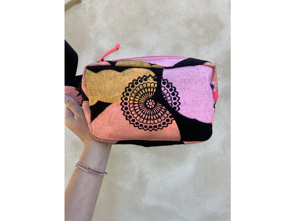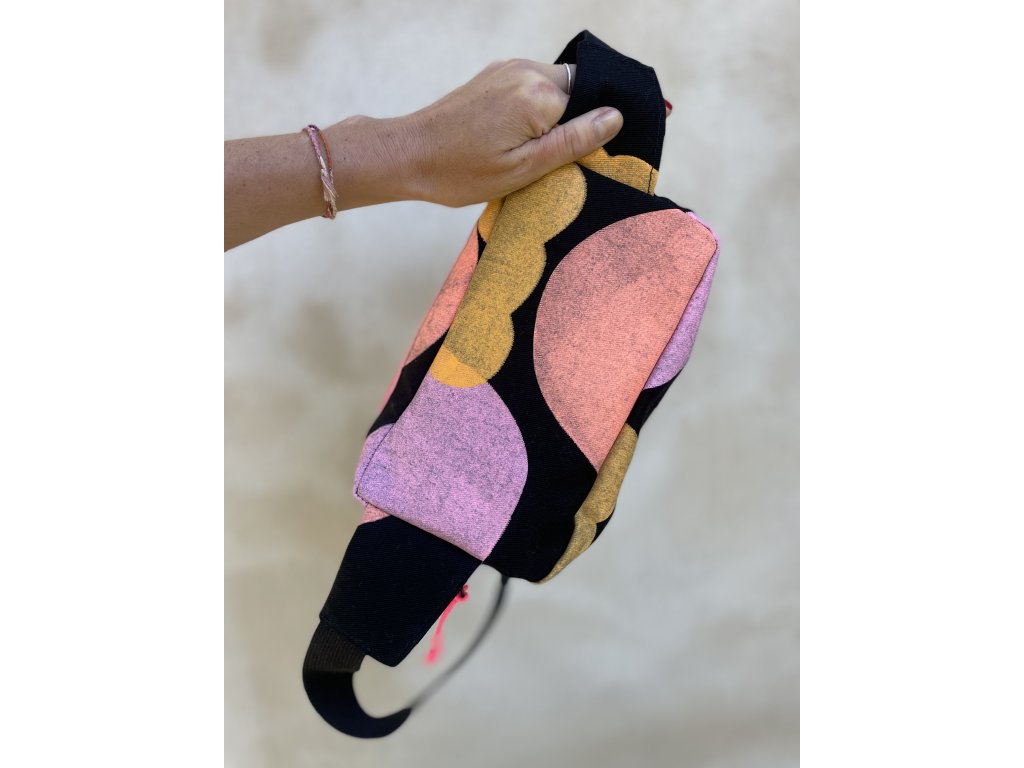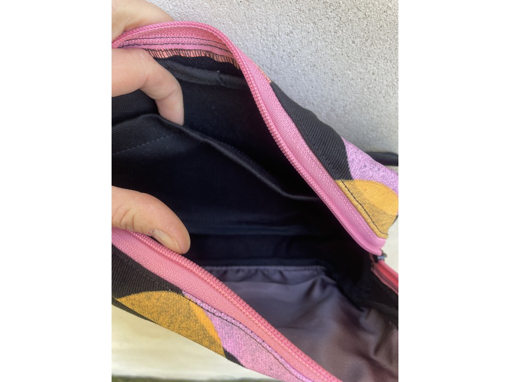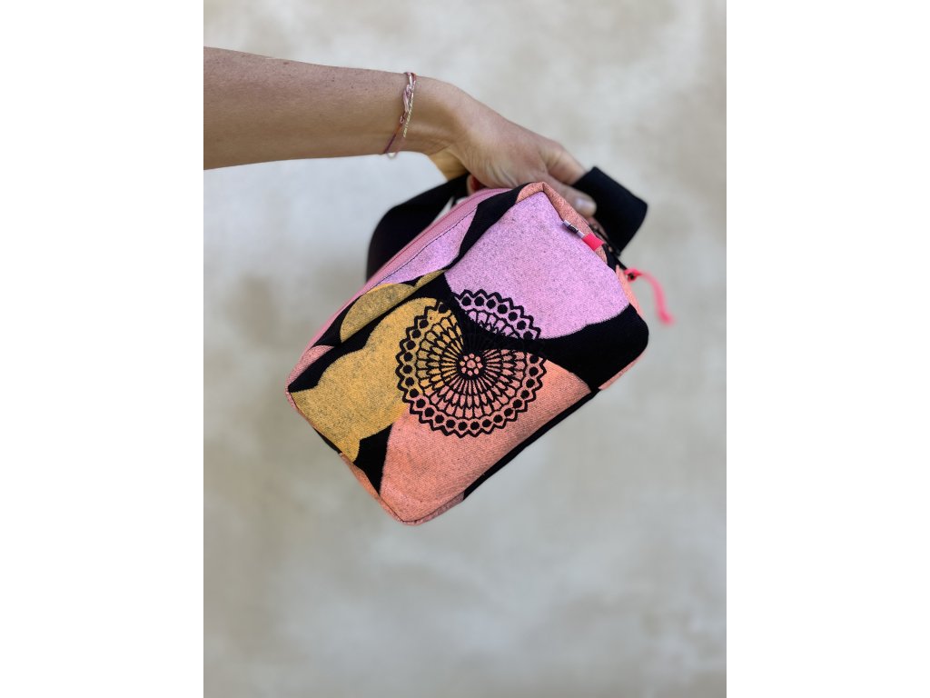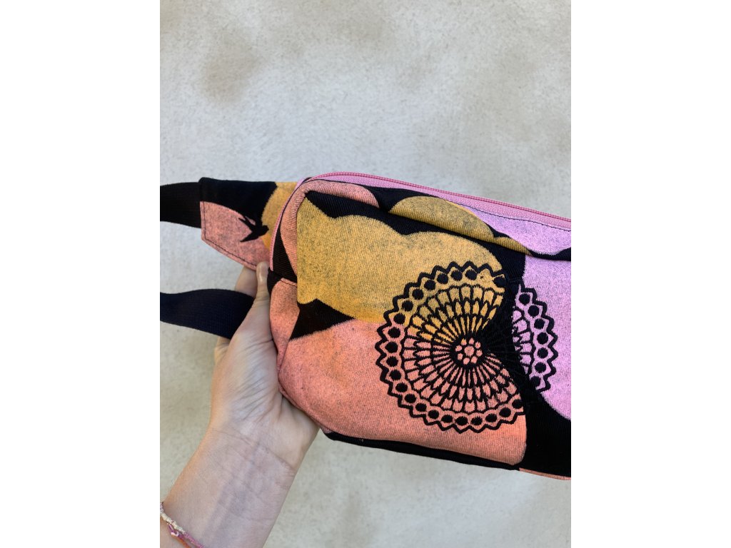 Ledvinka je z černého, pevného a lehkého plátna, má potisk a výšivku mandaly na předním díle, uvnitř ledvinky jedna kapsa, nastavitelný popruh.