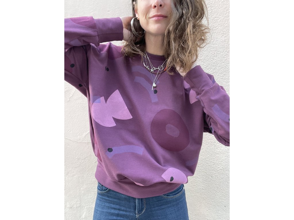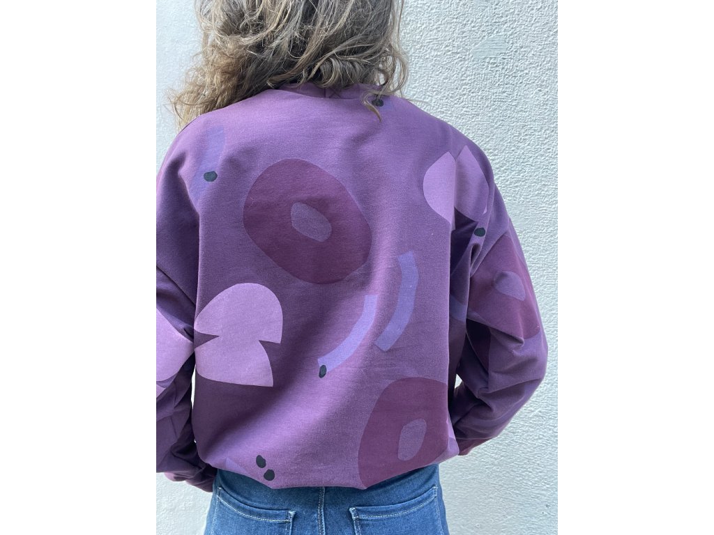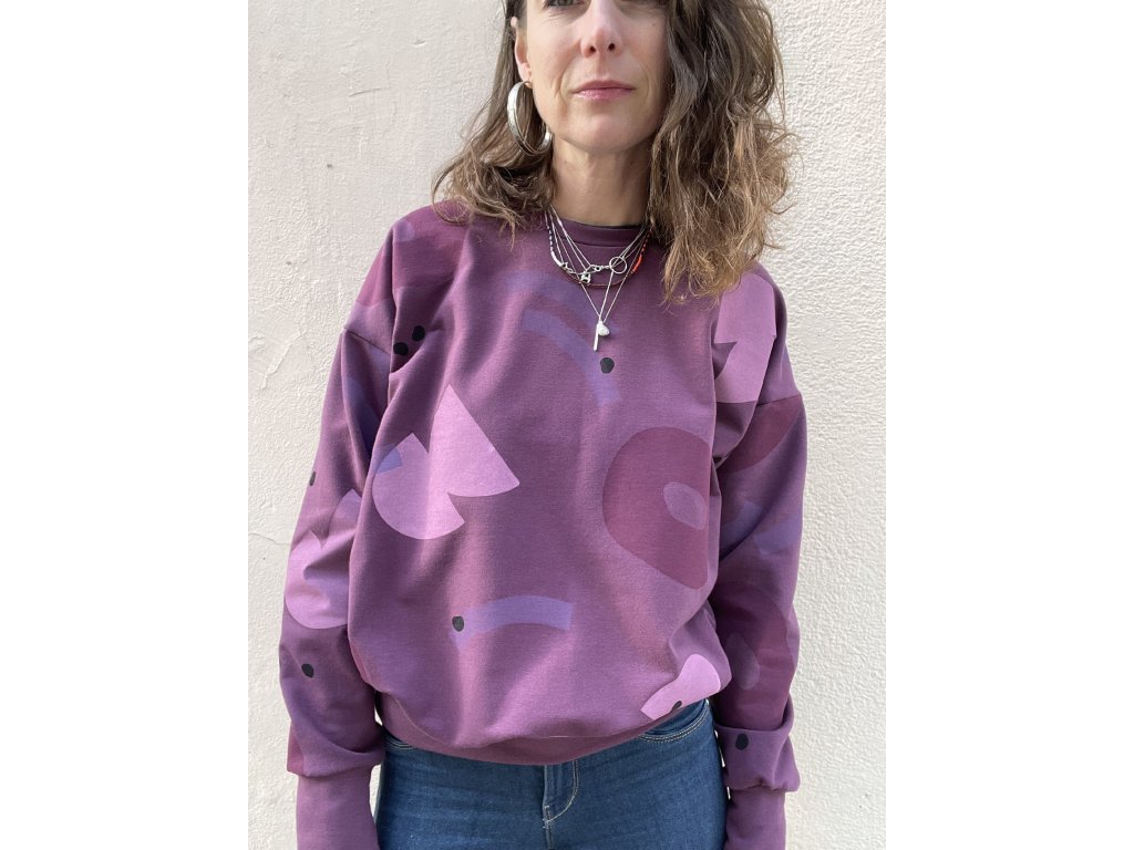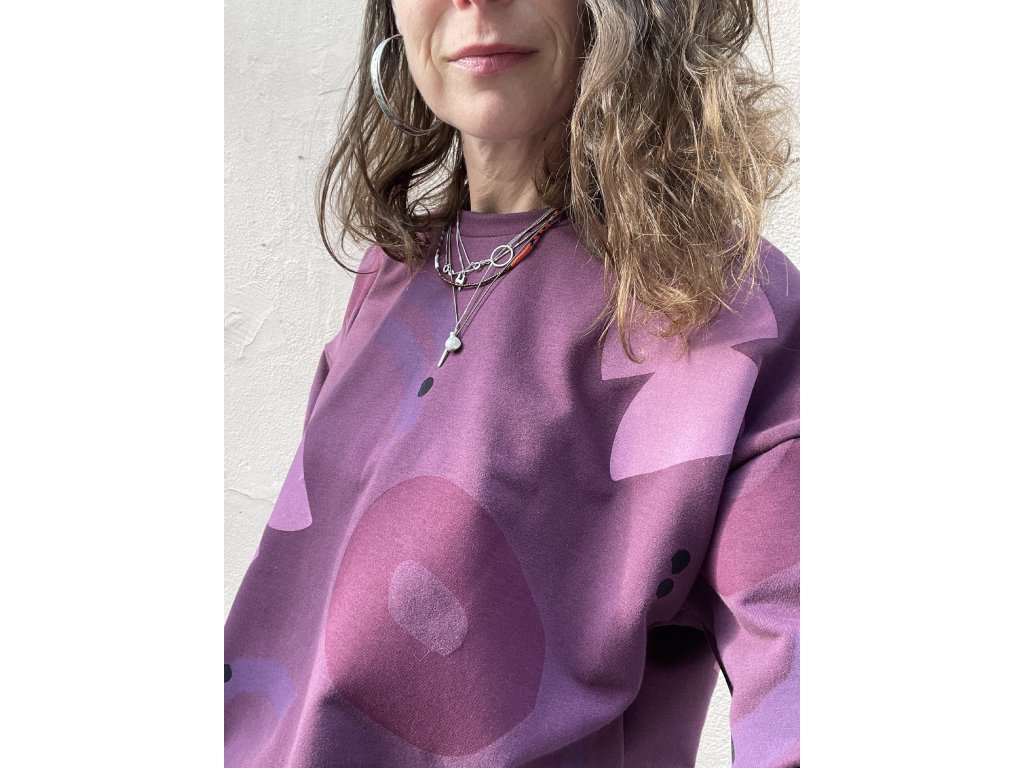 Mikina je z tenčí zateplené teplákoviny, má volný oversize střih, barevný celoplošný potisk