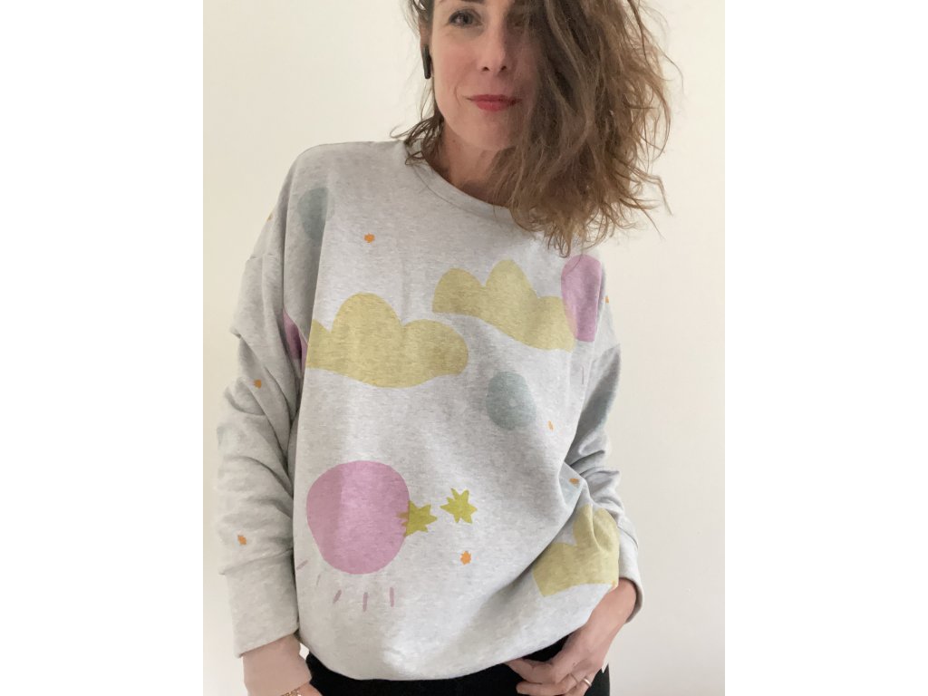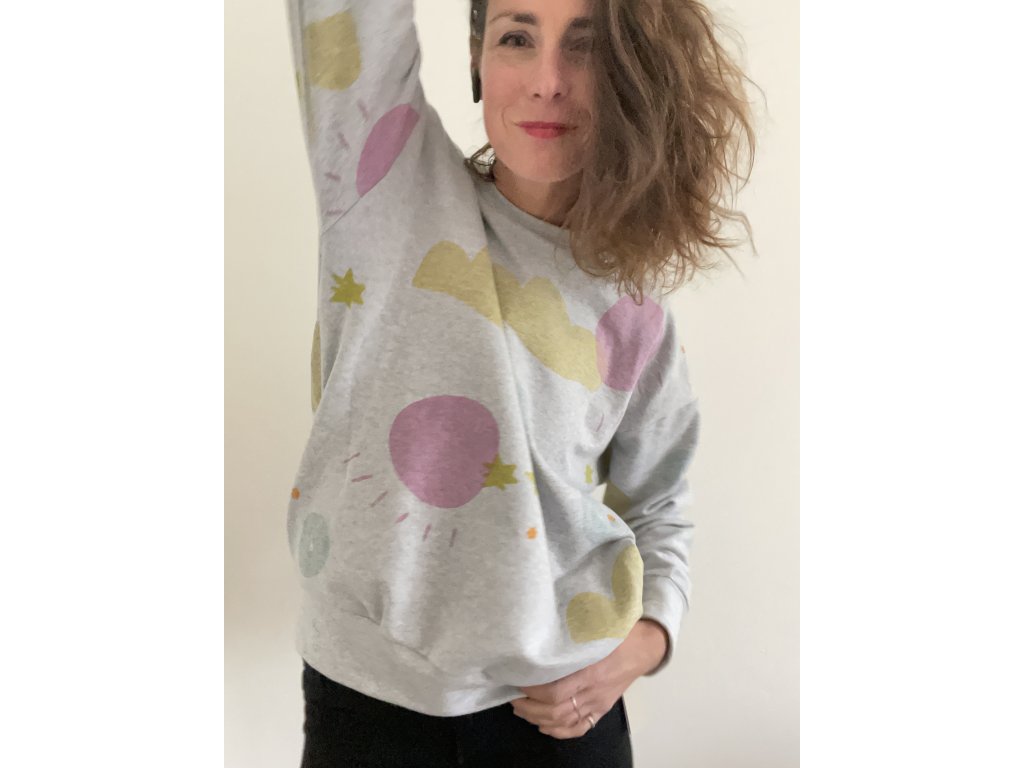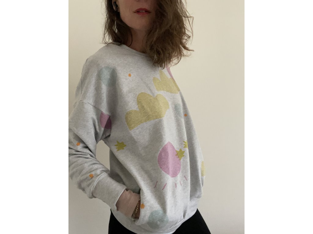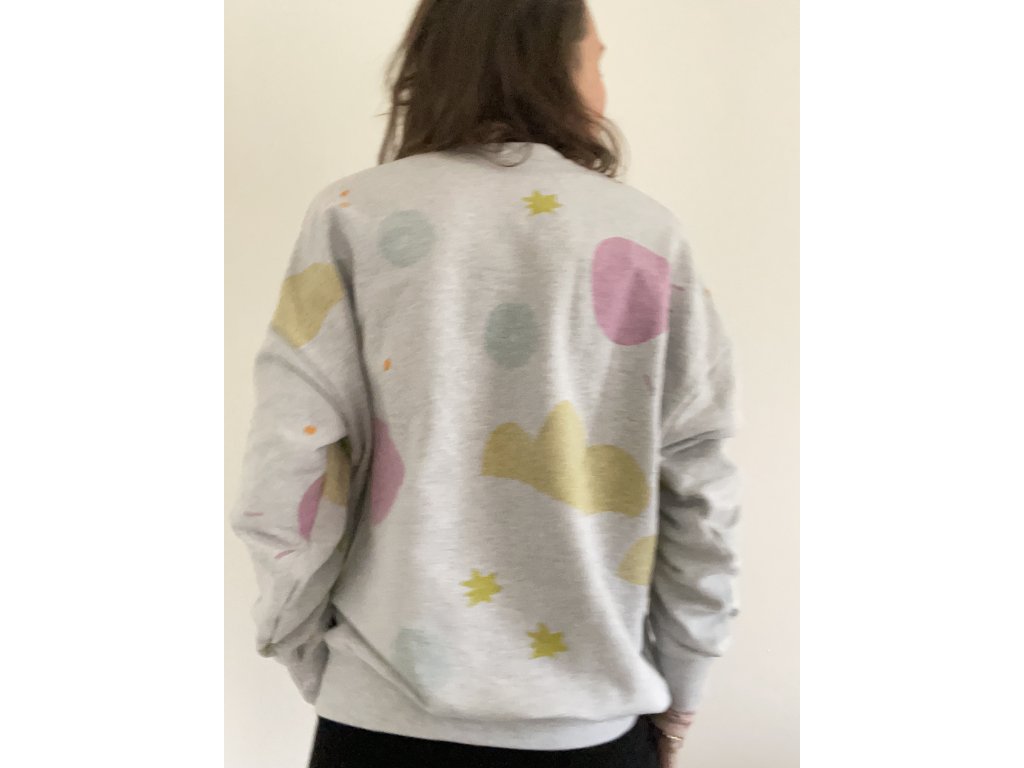 Mikina je ze zateplené šedé teplákoviny, má jemný pastelový motiv, kapsy v bocích.