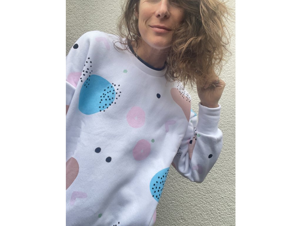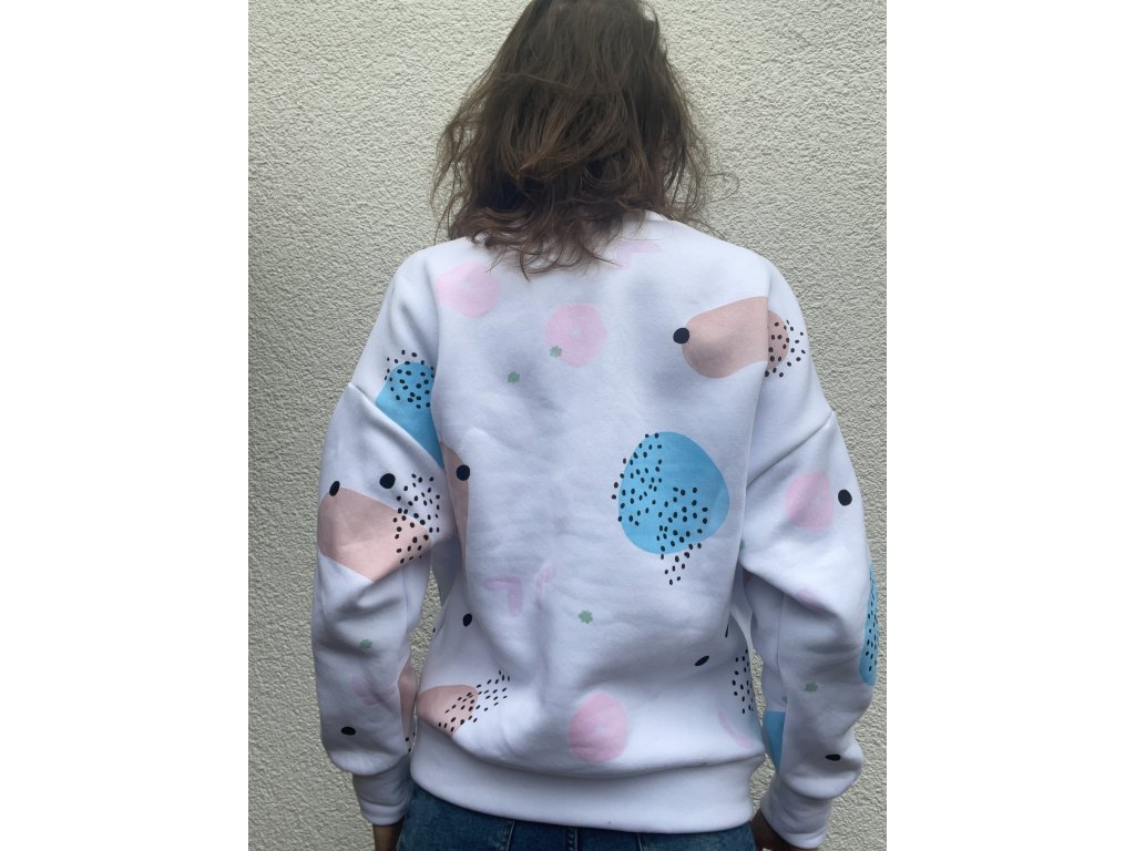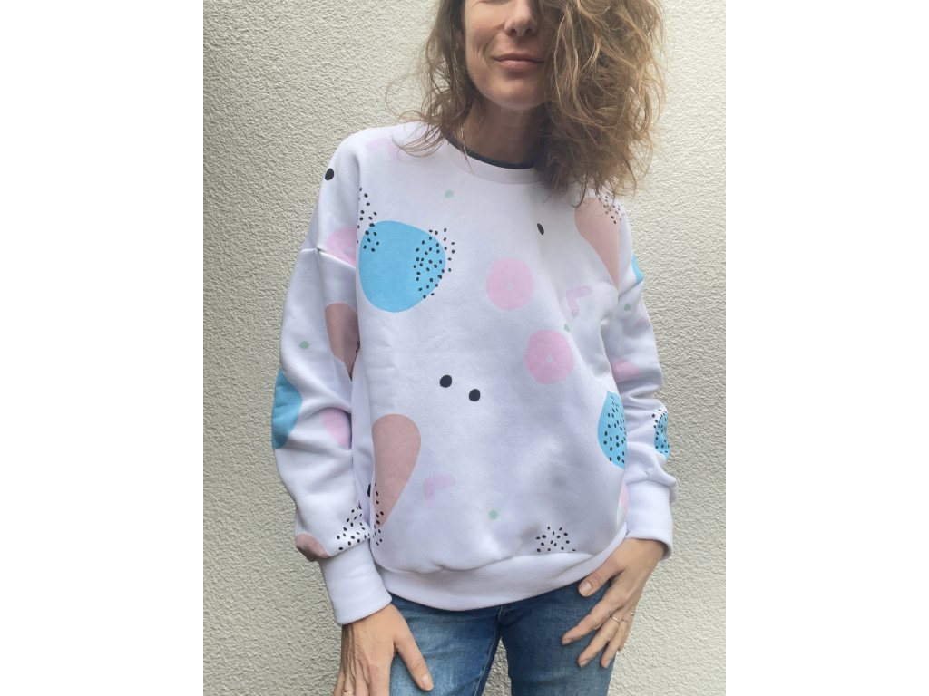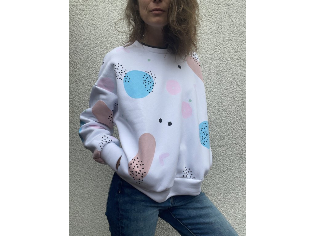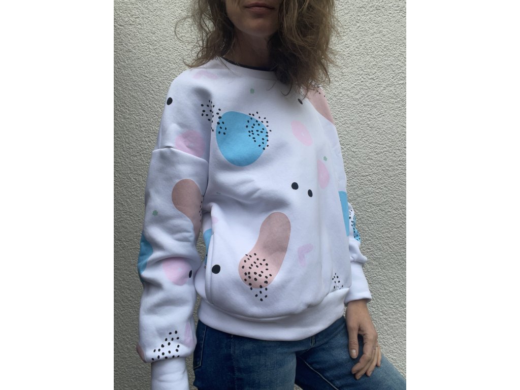Mikina je z bílé zateplené teplákoviny, má kapsy v bocích, barevný potisk.Volný oversize střih.