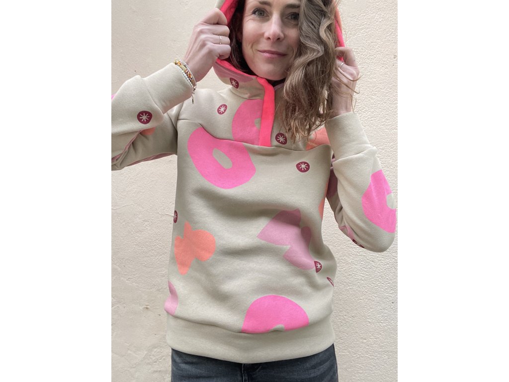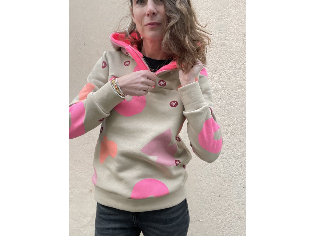 Mikina je ze zateplené teplákoviny, béžové barvy, mal barevný potisk, klasický střih, krátký růžový zip s výraznými růžovými patkami, dvojitá kapuca s růžovou fleecovou vnitřní částí.