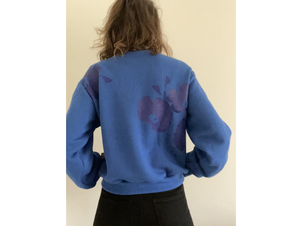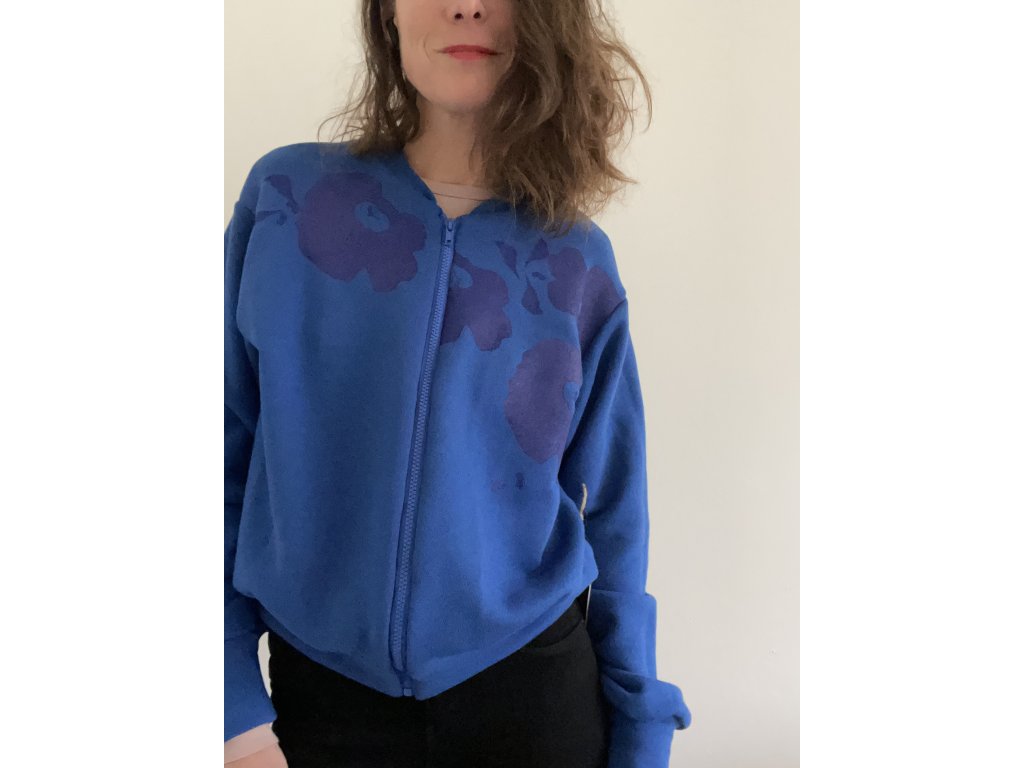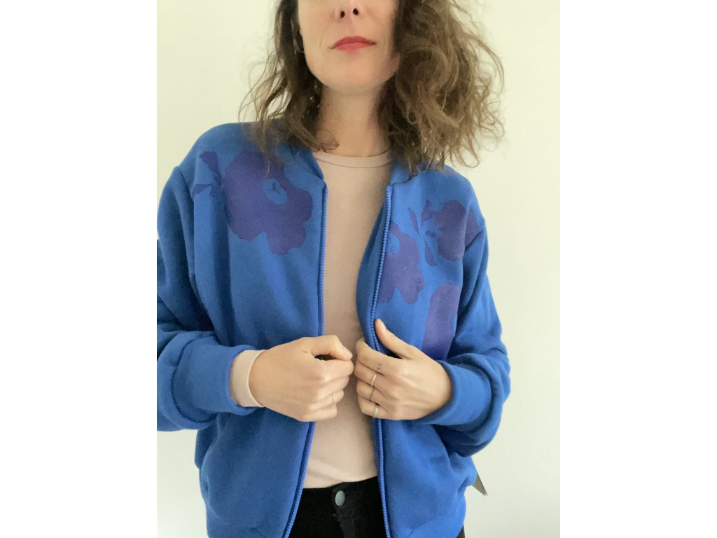Mikina je z modré, pružné teplákoviny, má jasně modrý potisk, střih bombr-oversize, zapínání na zip.