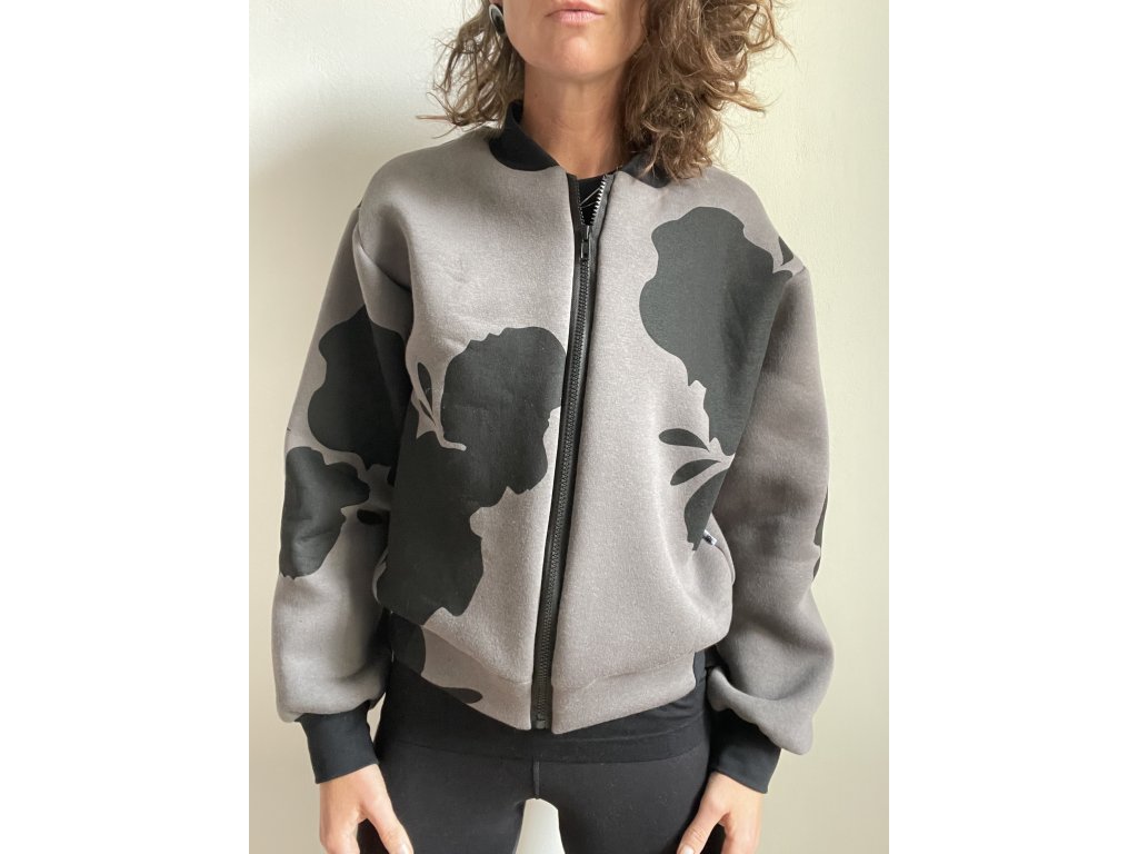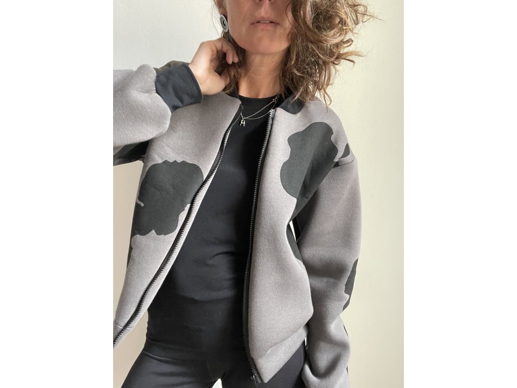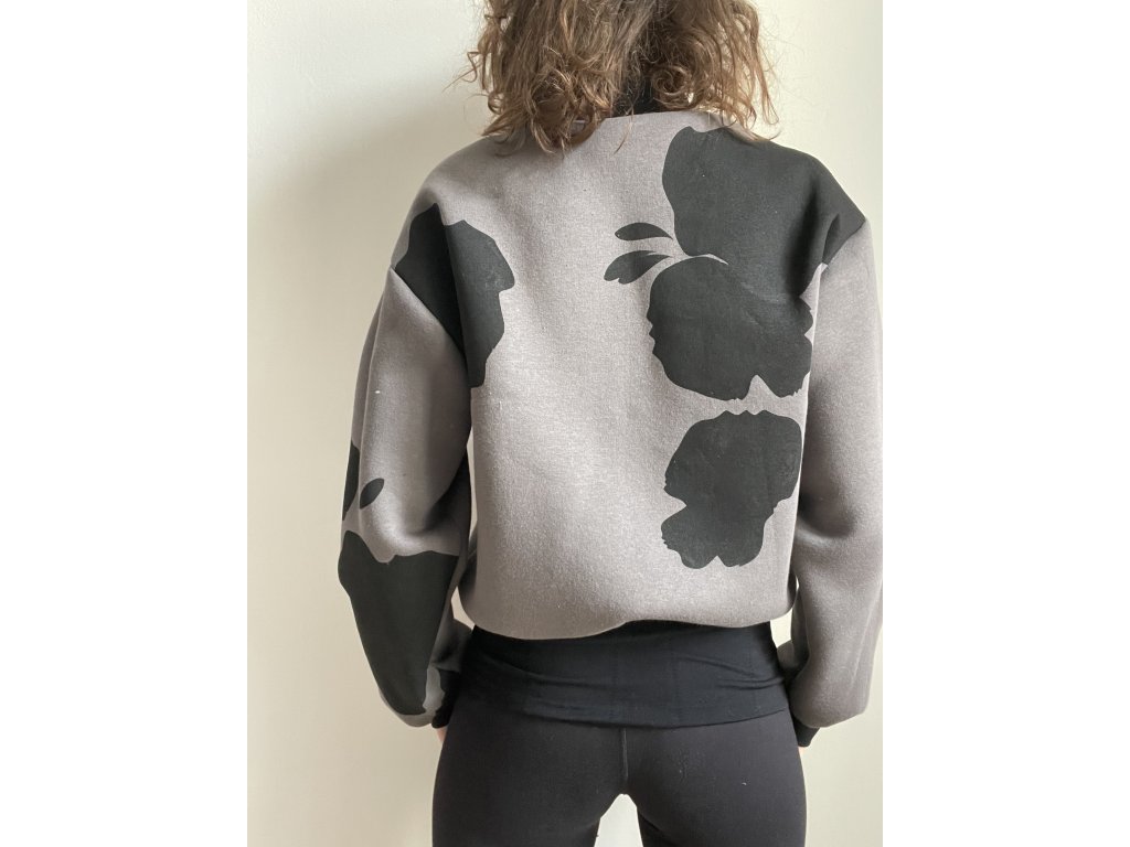 Mikina je z šedé zateplené teplákoviny, má černý potisk, zip a lemování. Oversize střih.Do pasu.