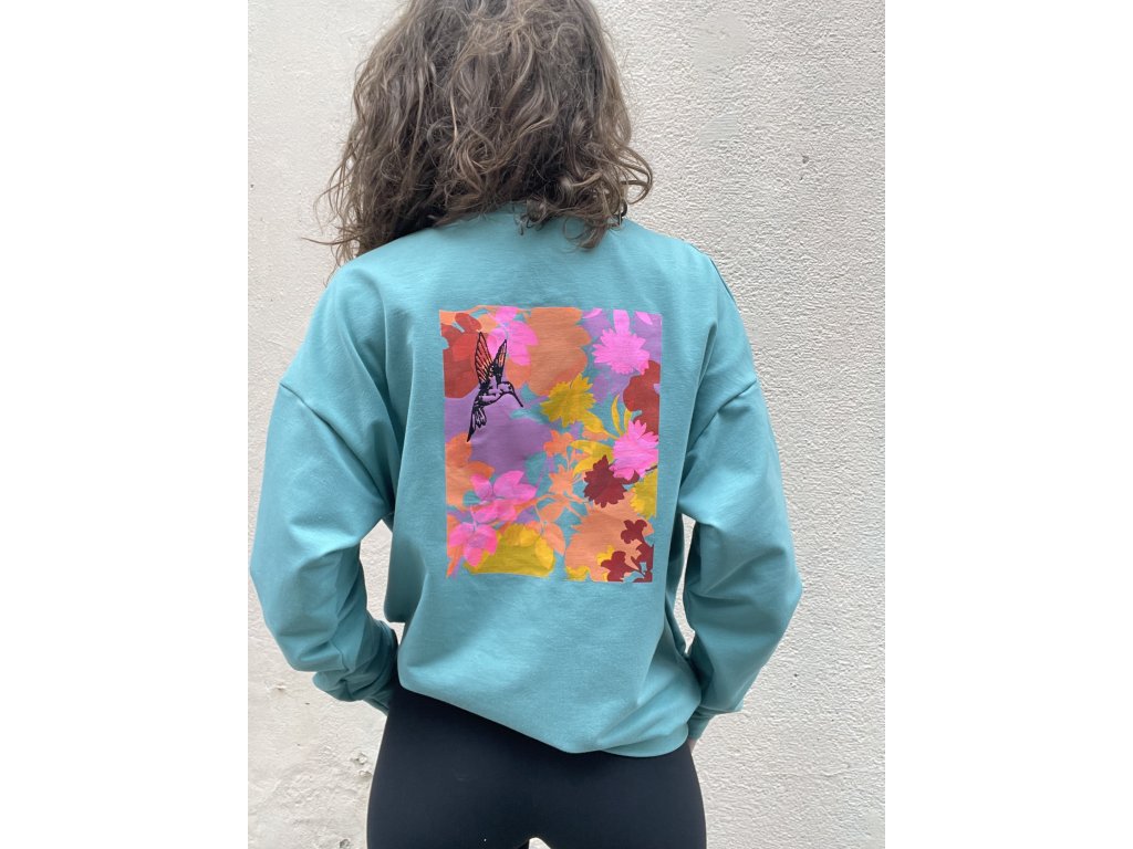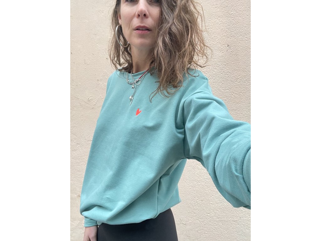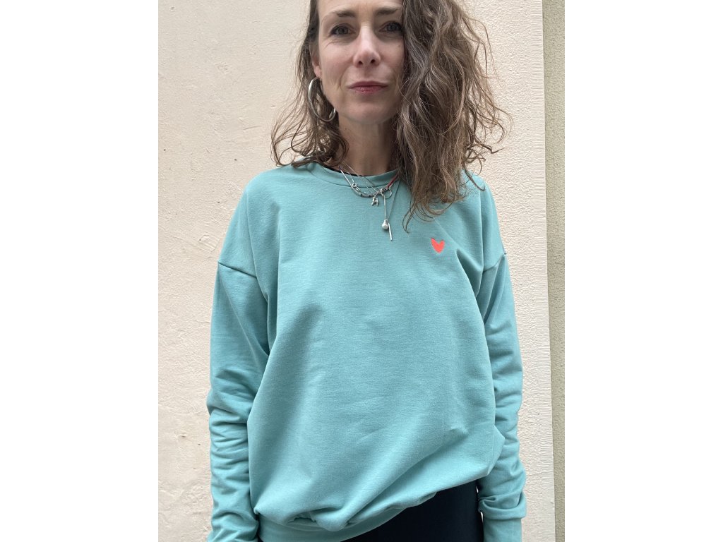 Mikina je z mentolové tenčí zateplené teplákoviny, má volný oversize střih, barevný tisk n zádech s černou výšivkou.Na předním díle pink výšivka.