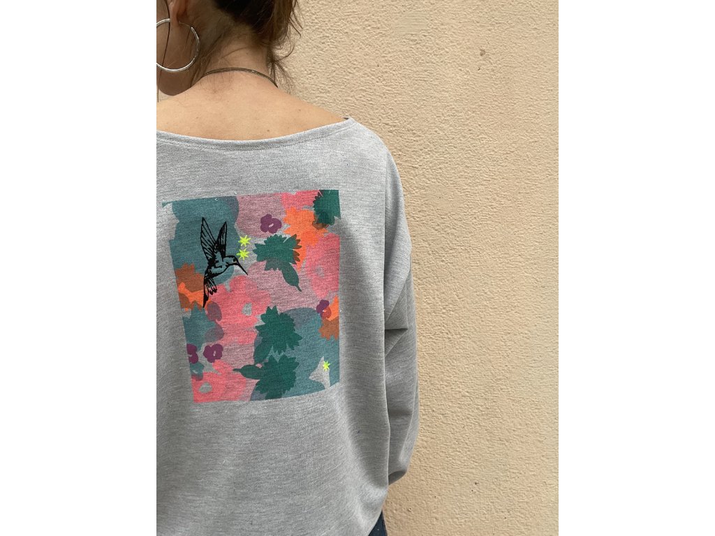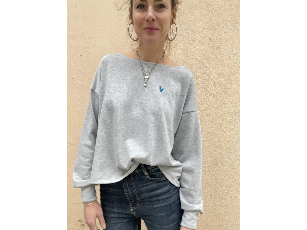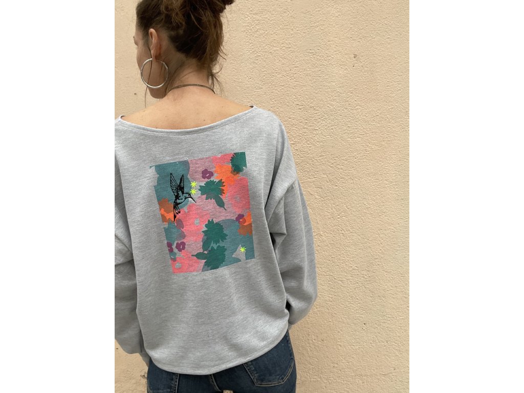 Mikina je z tenké šedé teplákoviny, volný oversize střih, barevný tisk a výšivka na zádech a tyrkys výšivka na prsu, lodičkový výstřih.