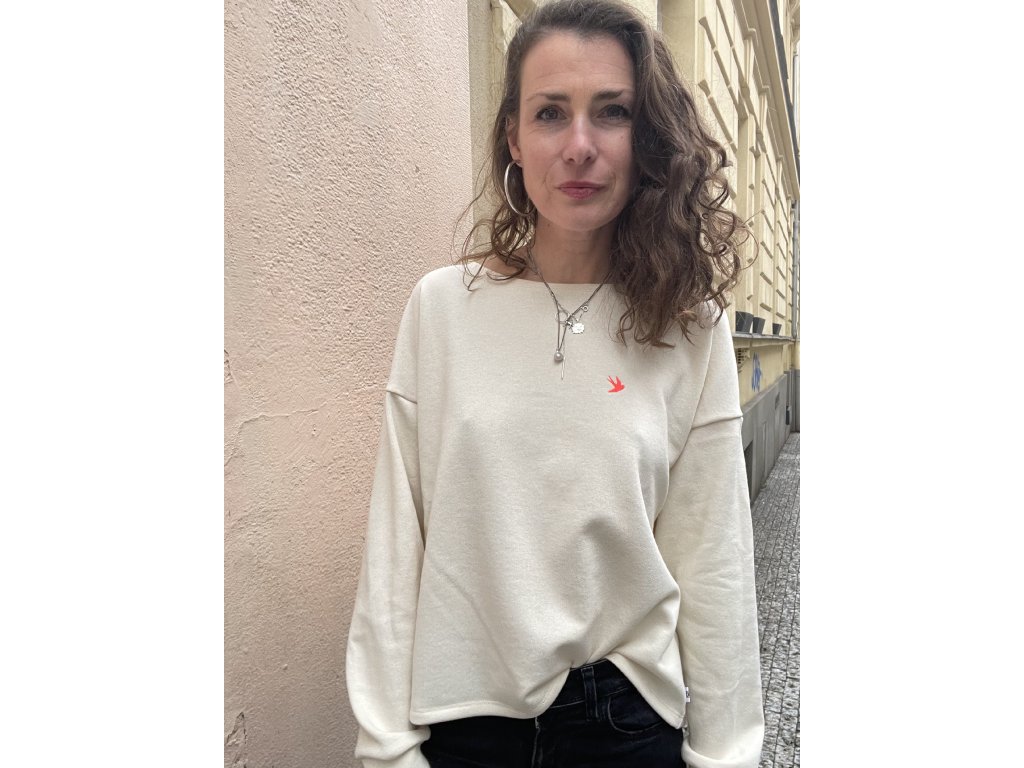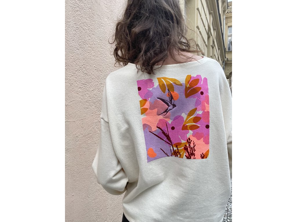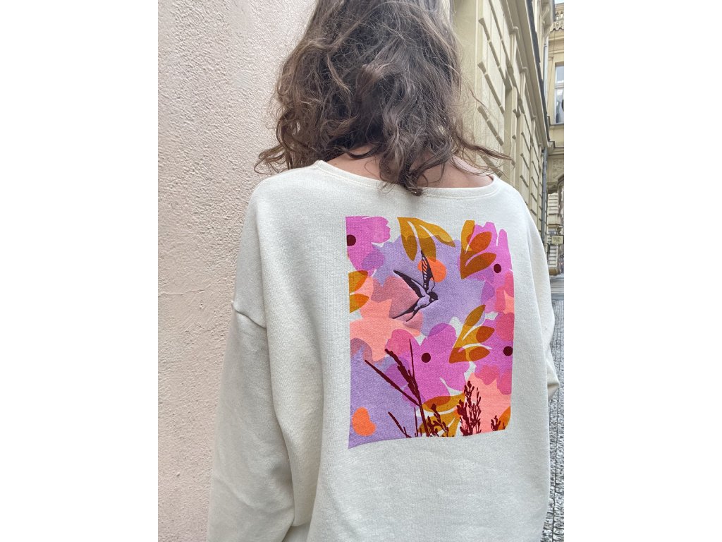 Mikina je z pružné smetanové teplákoviny, má volný střih a lodičkový výstřih, barevný tisk na zádech s fialkovou výšivkou. Pink výšivka na prsu.