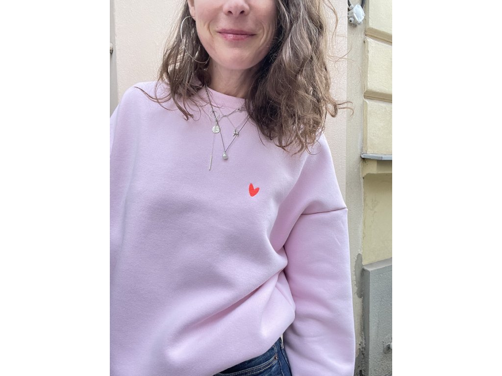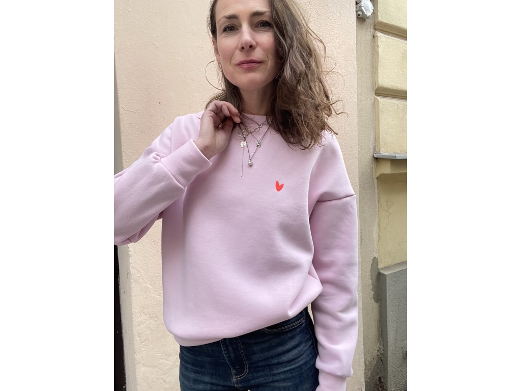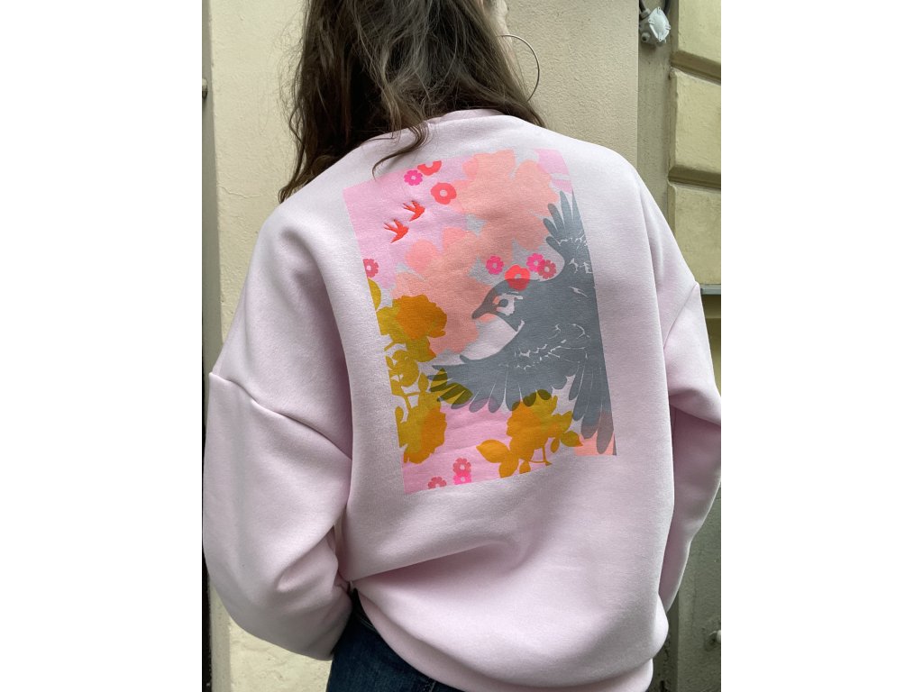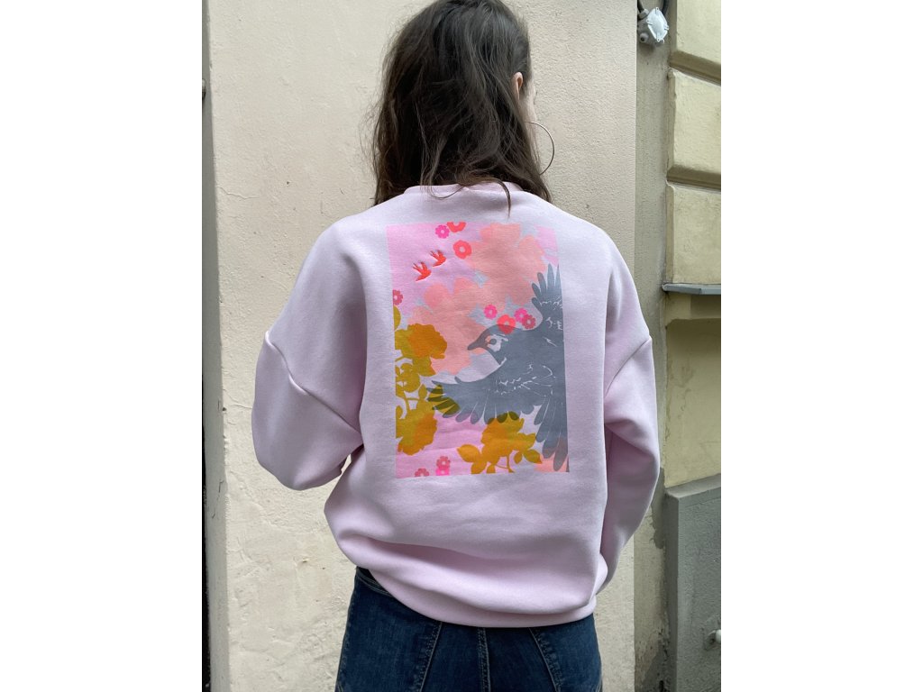 Mikina má sv.růžovou barvu, volný oversize střih, pink výšivku na prsu, barevný tisk a pink výšivku na zadním díle.