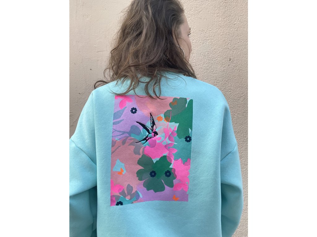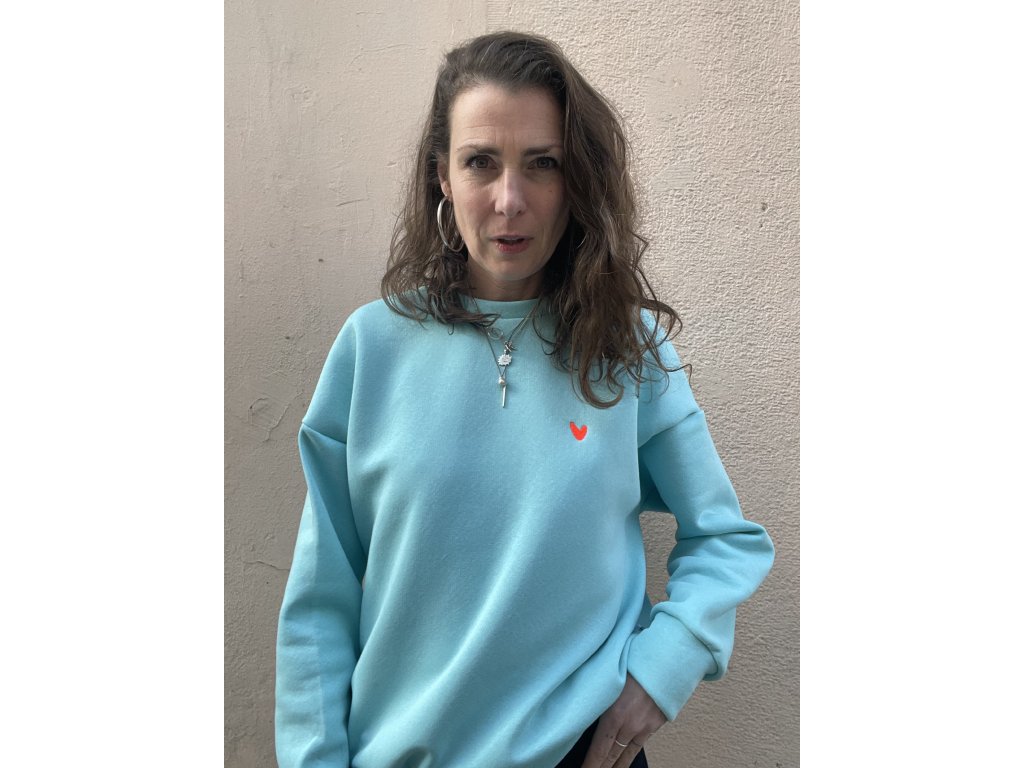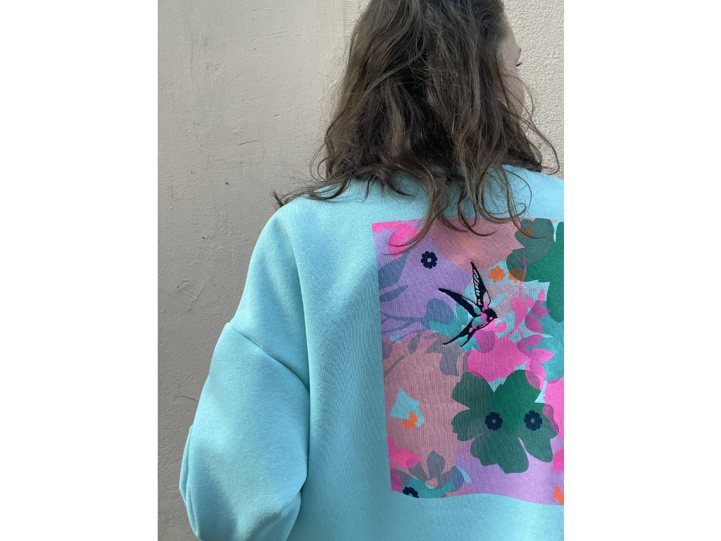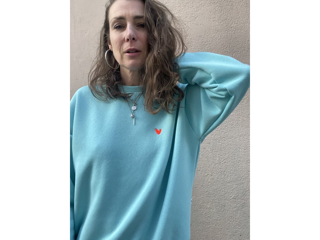 Mikina je ze světle tyrkysové zateplené teplákoviny, má volný oversize střih, pink výšivku srdce na prsu a na zádech barevný tisk a černou výšivku.