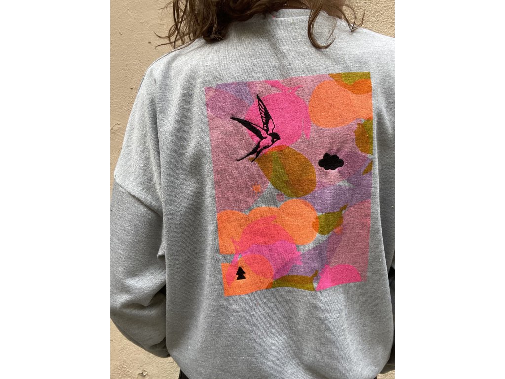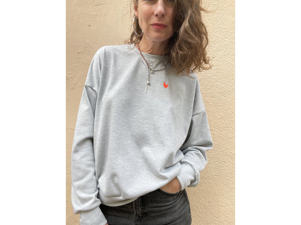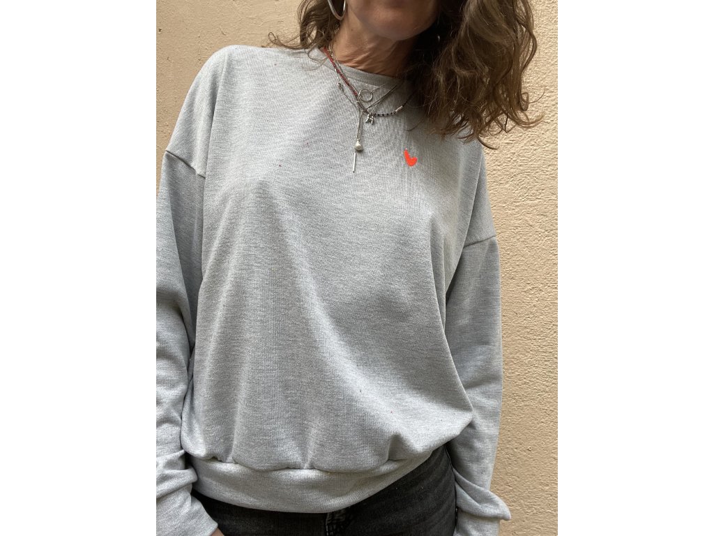 Mikina má volný oversize střih, šedá pružná teplákovina, výšivka neon pink na prsu, na zadním díle neon tisk plus černé výšivky.