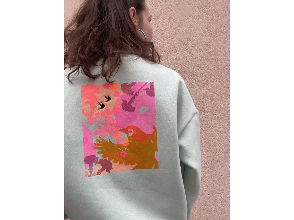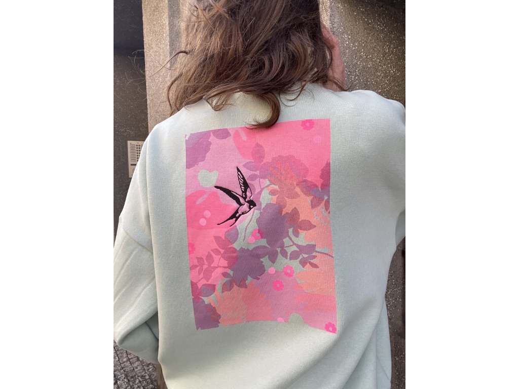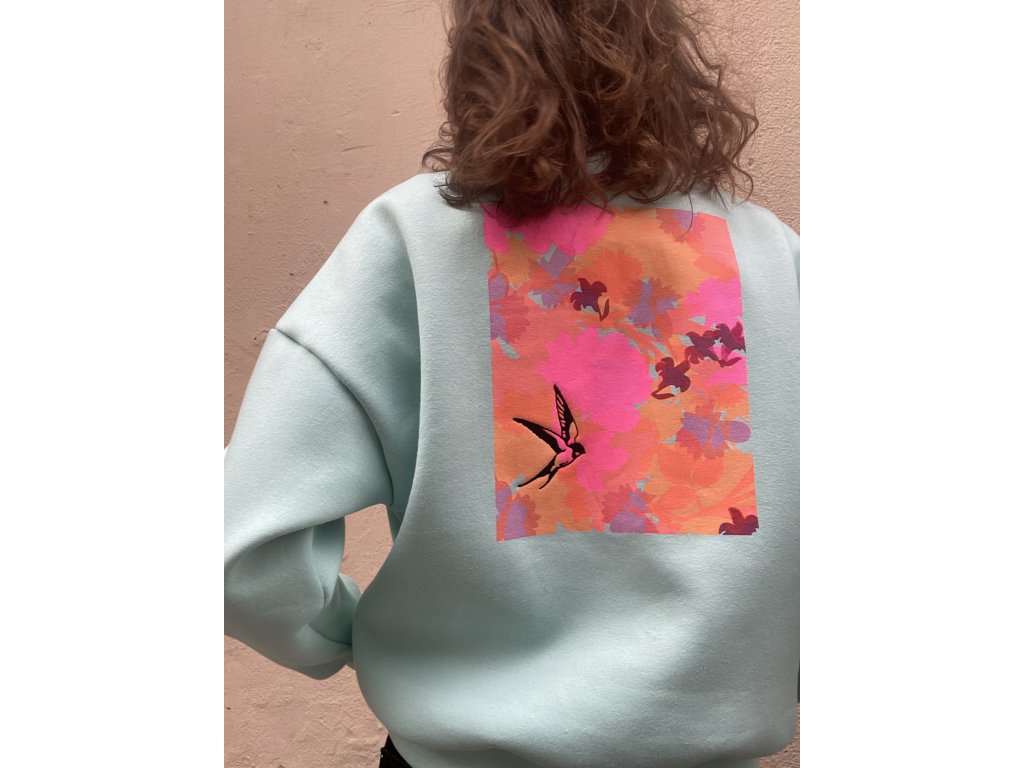 Mikina má oversize vilný střih, je ze zateplené teplákoviny, na prsu výšivka srdce, na zadním díle barevný tisk pˇus černá výšivka.