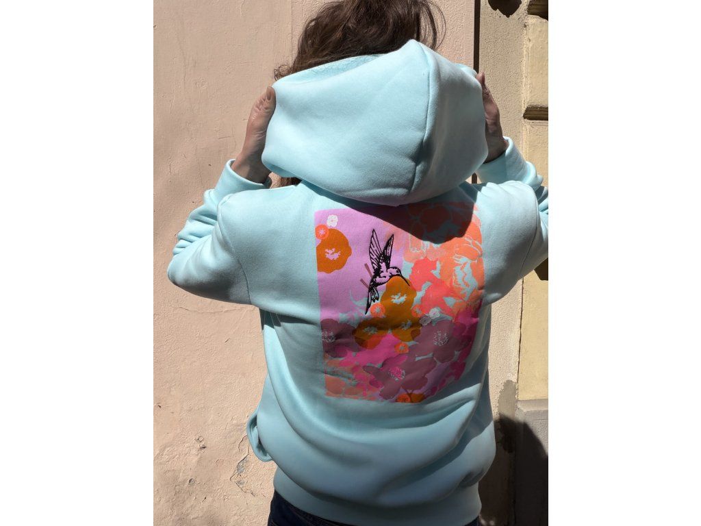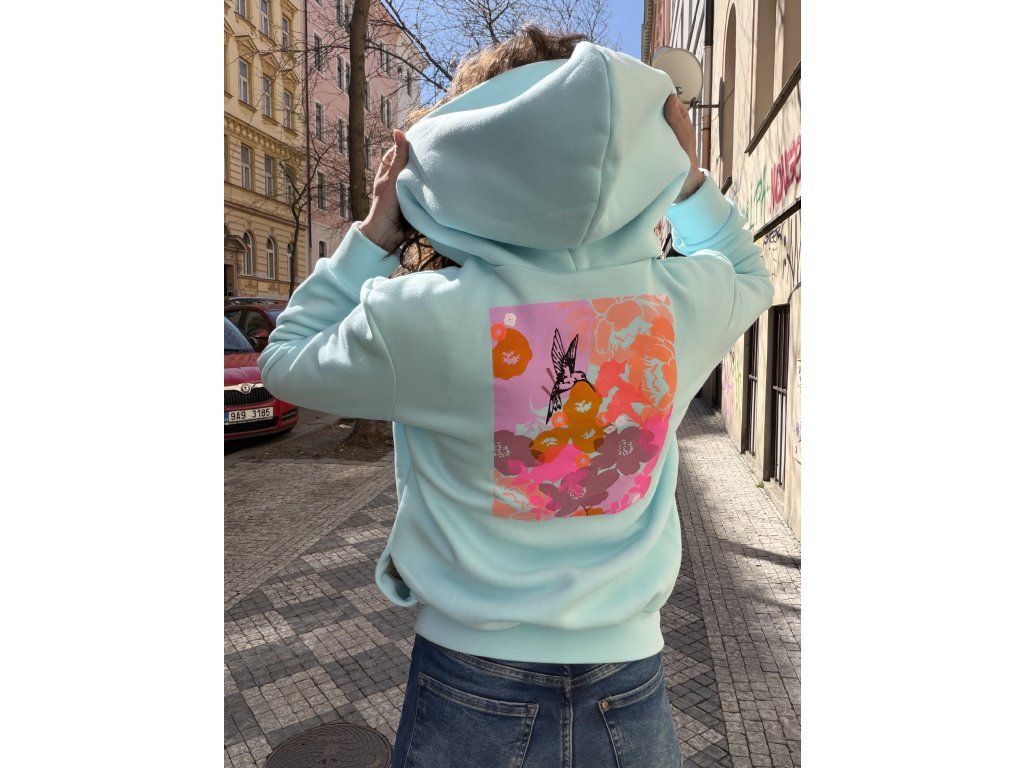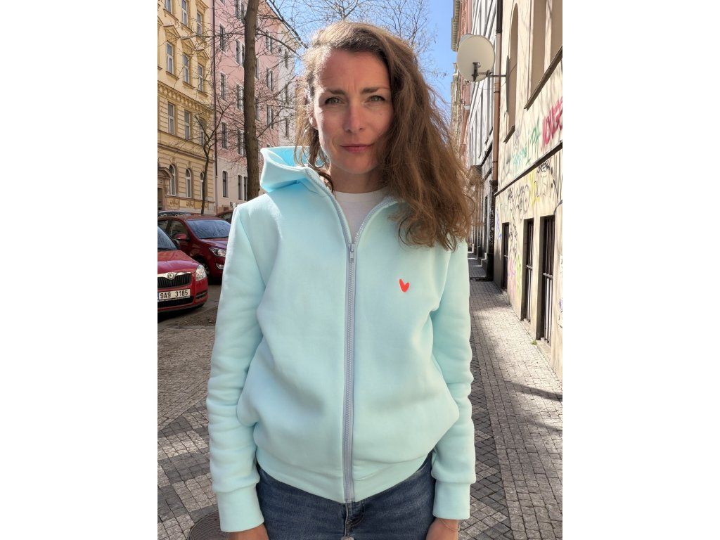 Mikina ze zateplené aqua teplákoviny má modrý zip do dvojité kapuce, vyšité srdce na prsu, barevný tisk s černou výšivkou na zádech, kapsy v bocích.