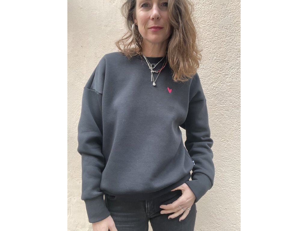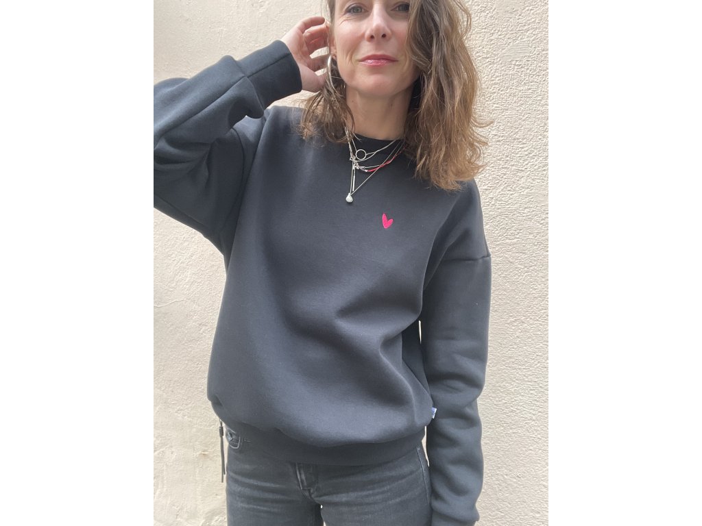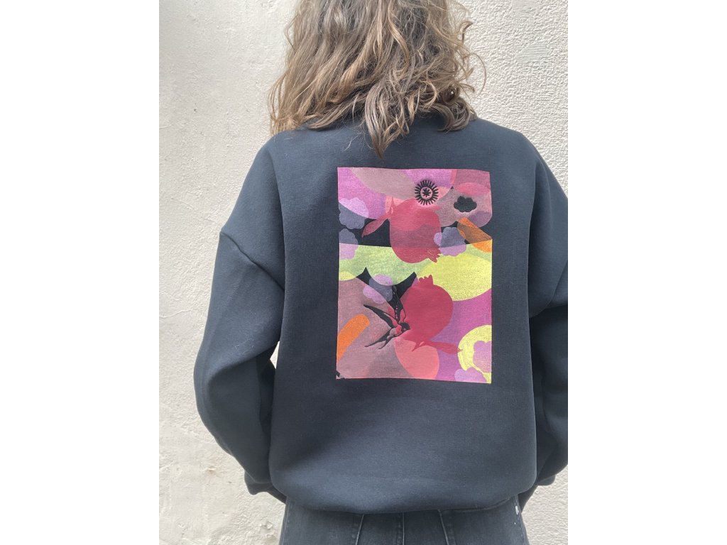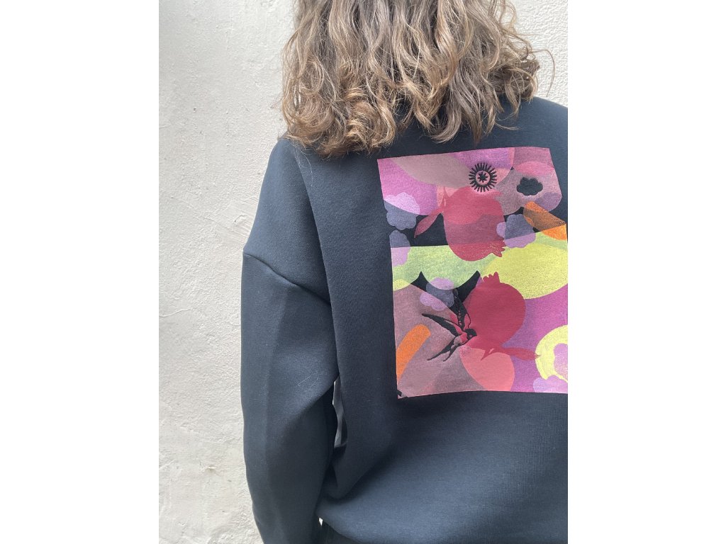 Mikina je z černé zateplené teplákoviny, má volný oversize střih, pink výšivka na předním díle, na zadním díle barevný tisk a černá výšivka…