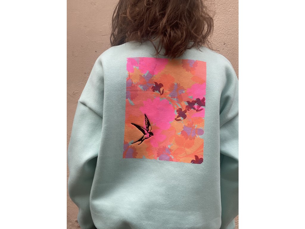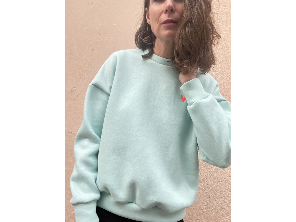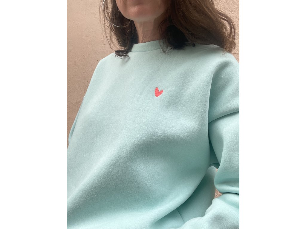Mentolová mikina je z extra zateplené teplákoviny, má volný střih, pink výšivku na prsu, tisk a černou výšivku na zádech.Pružná