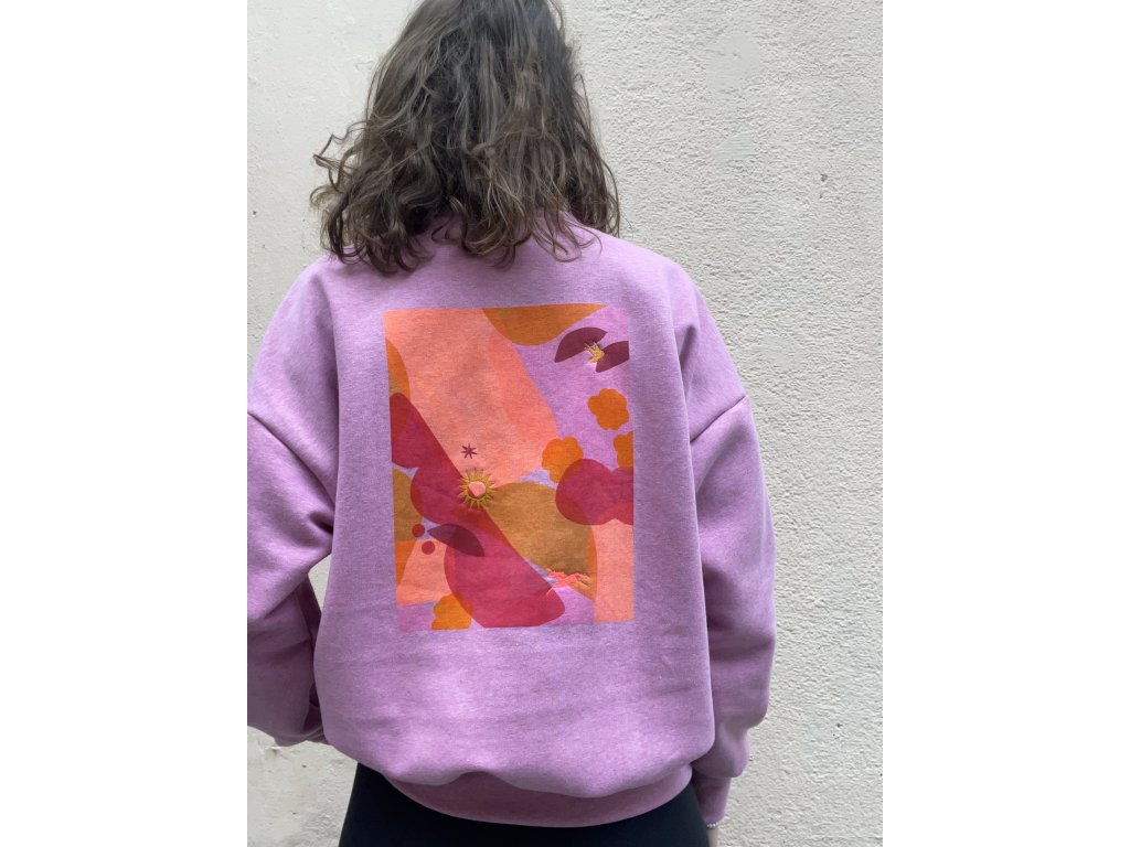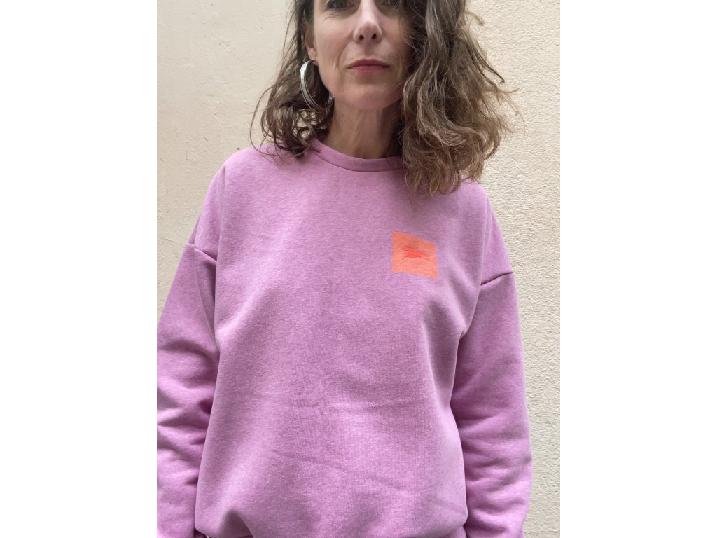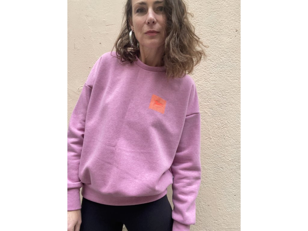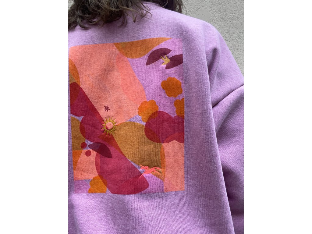 Mikina je z melange zateplené teplákoviny, má oversize střih do pasu, barevný tisk na zádech s výšivkou, na předním díle vyšitý detail ve čtverci.