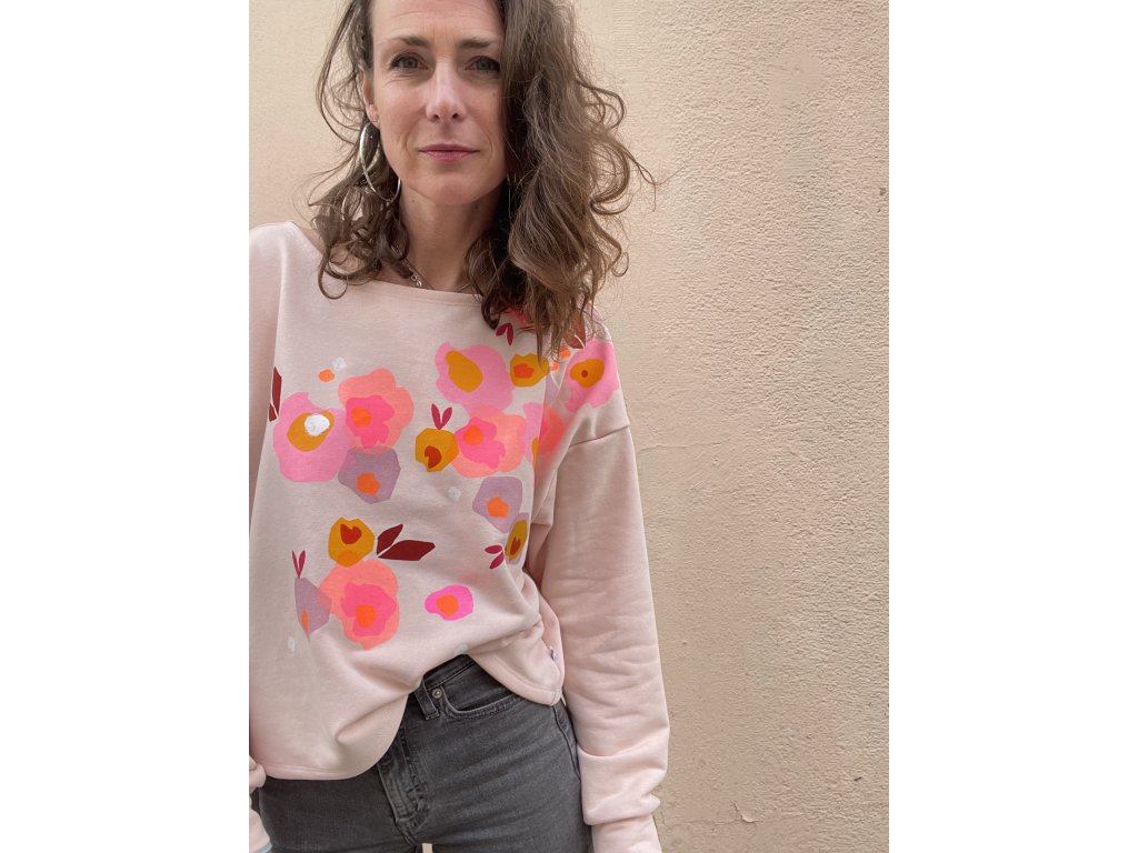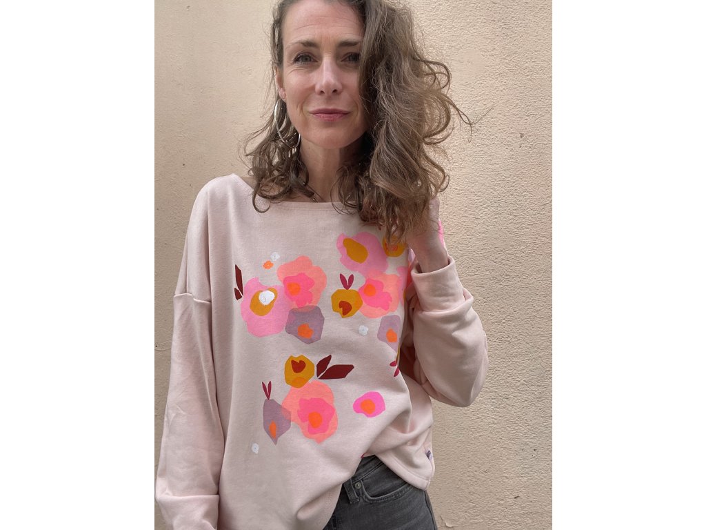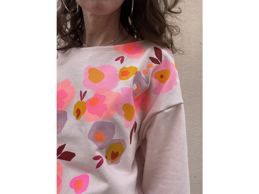 Mikina je ze sv.růžové tenké a pružné teplákoviny, má volný oversize střih do pasu, lodičkový výstřih, barevný motiv květů na předním díle a za krkem detail