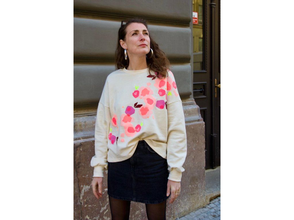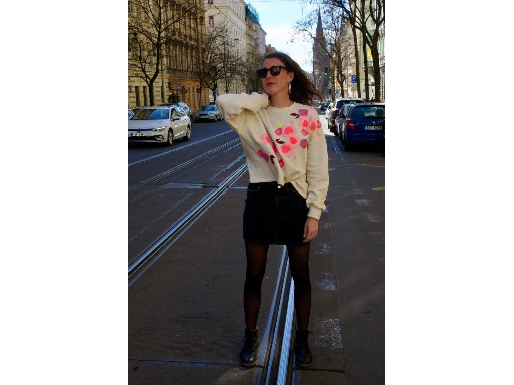 Mikina je z natur pružné teplákoviny, má vilný oversize široký střih do pasu, barevný/ neonový tisk, na zadním díle detail.