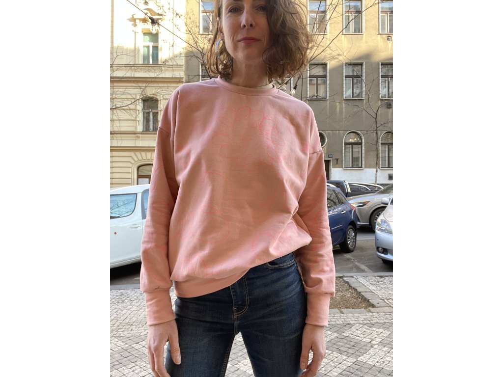 Mikina je z tenčí zateplené teplákoviny starorůžové barvy.Má oversize střih, sv. neonový “žvejkačkový” potisk.