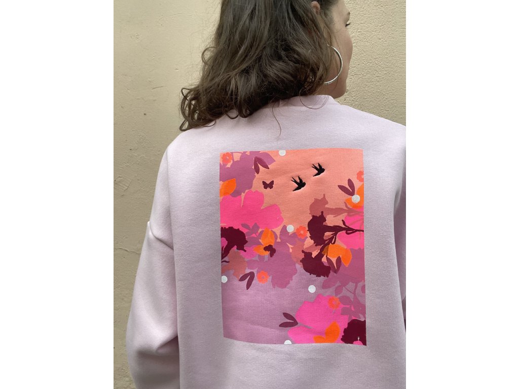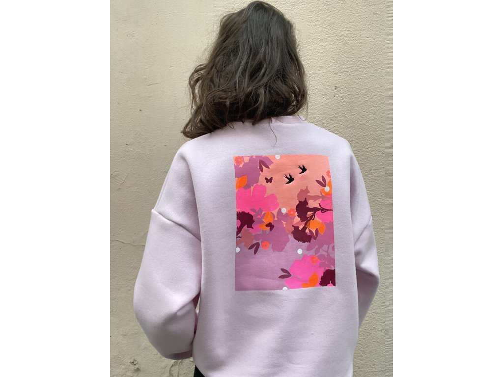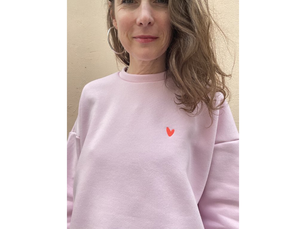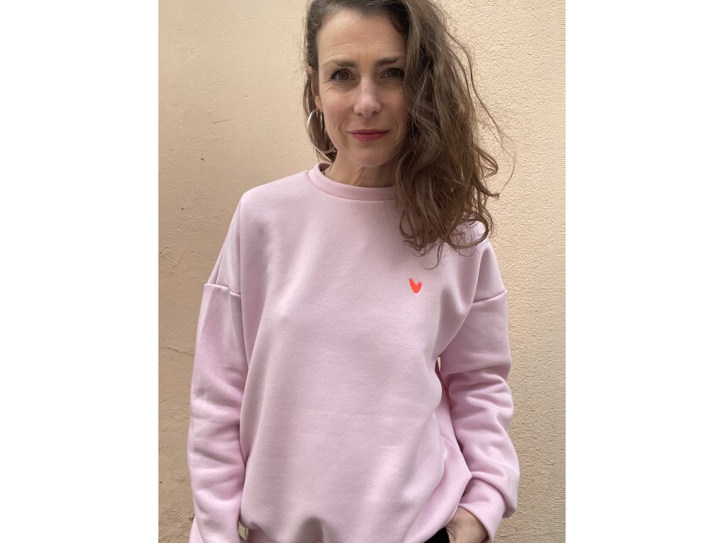 Sv.růžová oversize mikina je ze zateplené teplákoviny, na prsu vyšité pink srdíčko, na zádech barevný tisk s černou výšivkou.